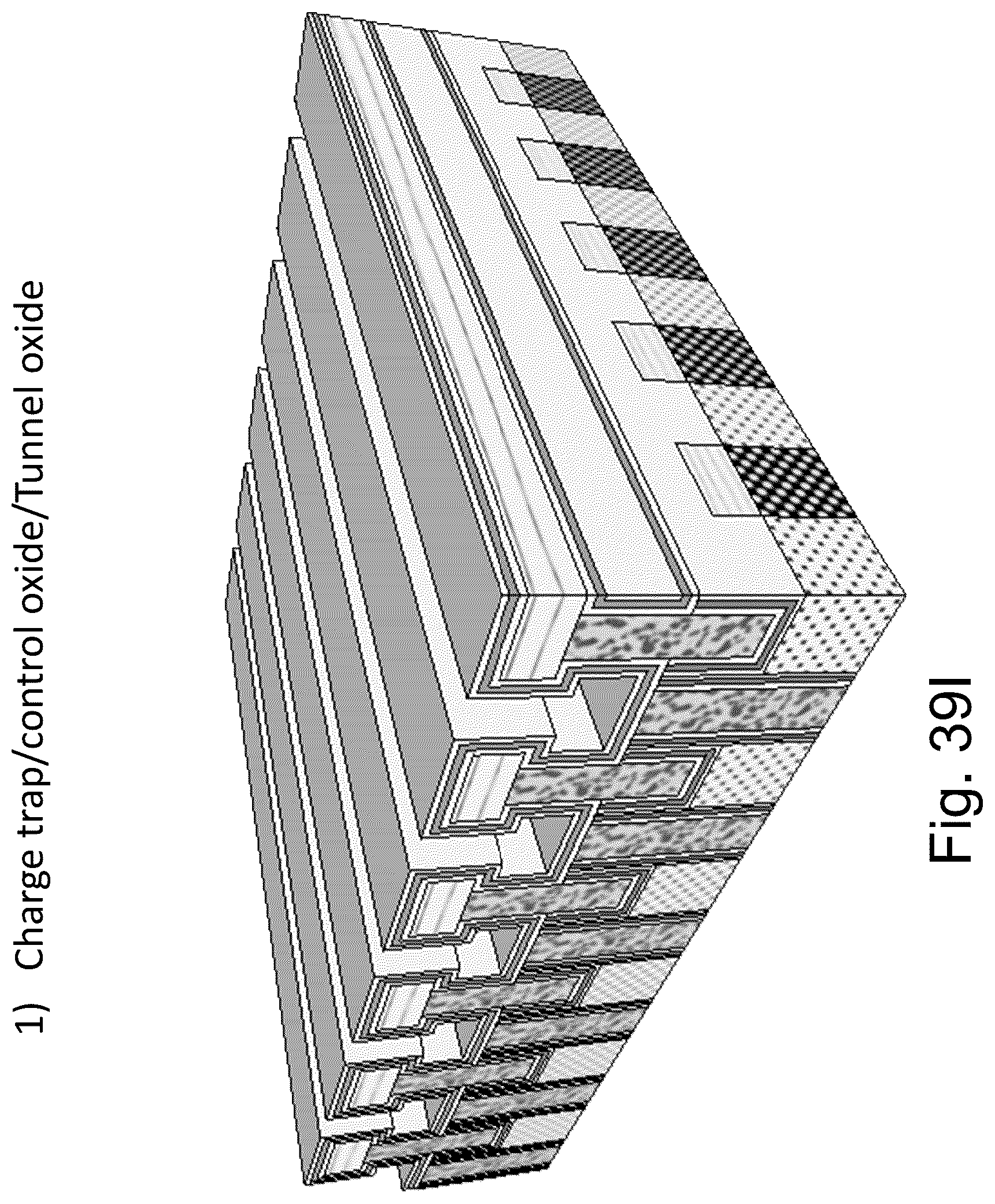 [0249]FIG. 39N illustrates the resulted structure of the original gate lines are now also controlling three facets of the top NOR structure with a channel each having three facets controlled by gates and with parallel access to their Source and Drains. As the same mechanism explained before, the polysilicon channel based top NOR structure can be configured to be used as multi-bit cells.
