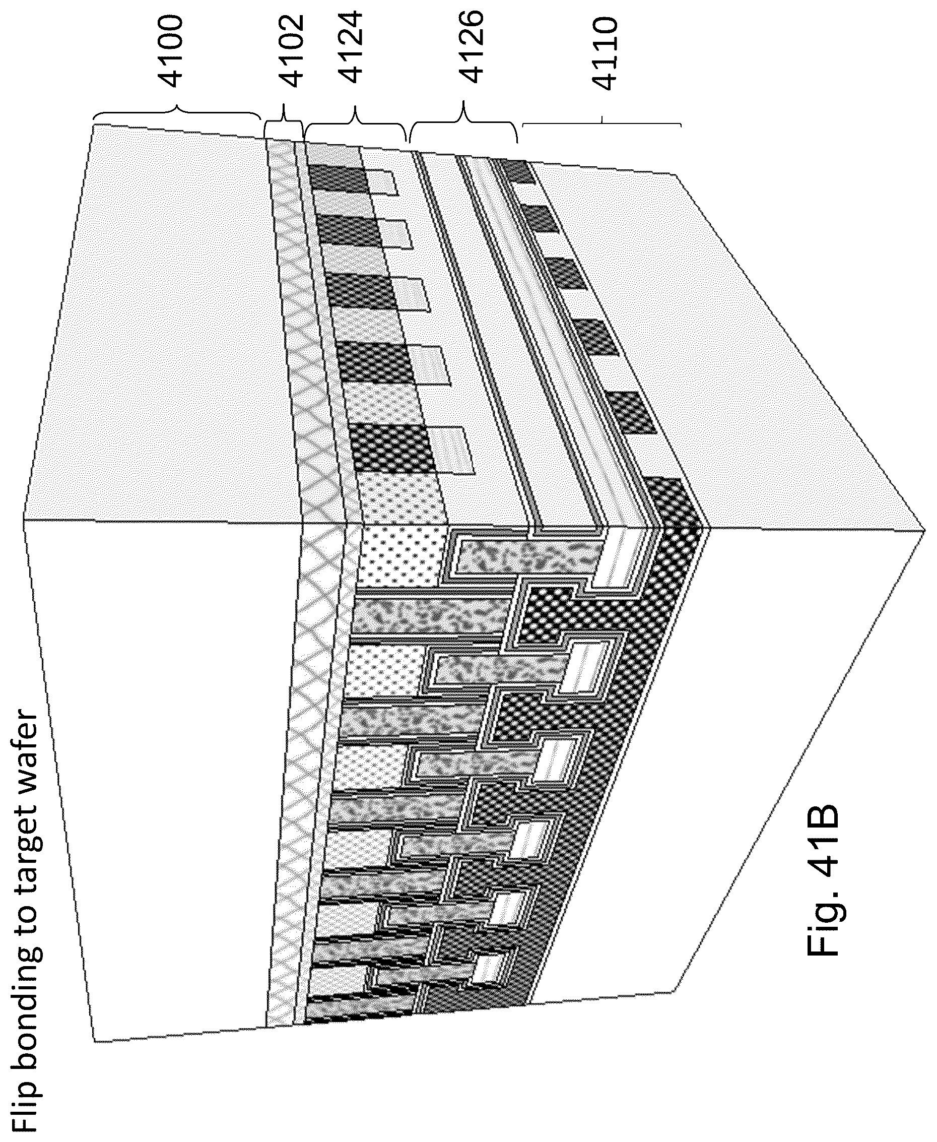 [0253]FIG. 41B illustrates the structure of FIG. 41A being flipped and bonded on top of a carrier substrate 4110. The poly-silicon based NOR 4126, then on top of it the crystalline based NOR 4124, and then the cut porous layers 4102 and the donor carrier 4100.