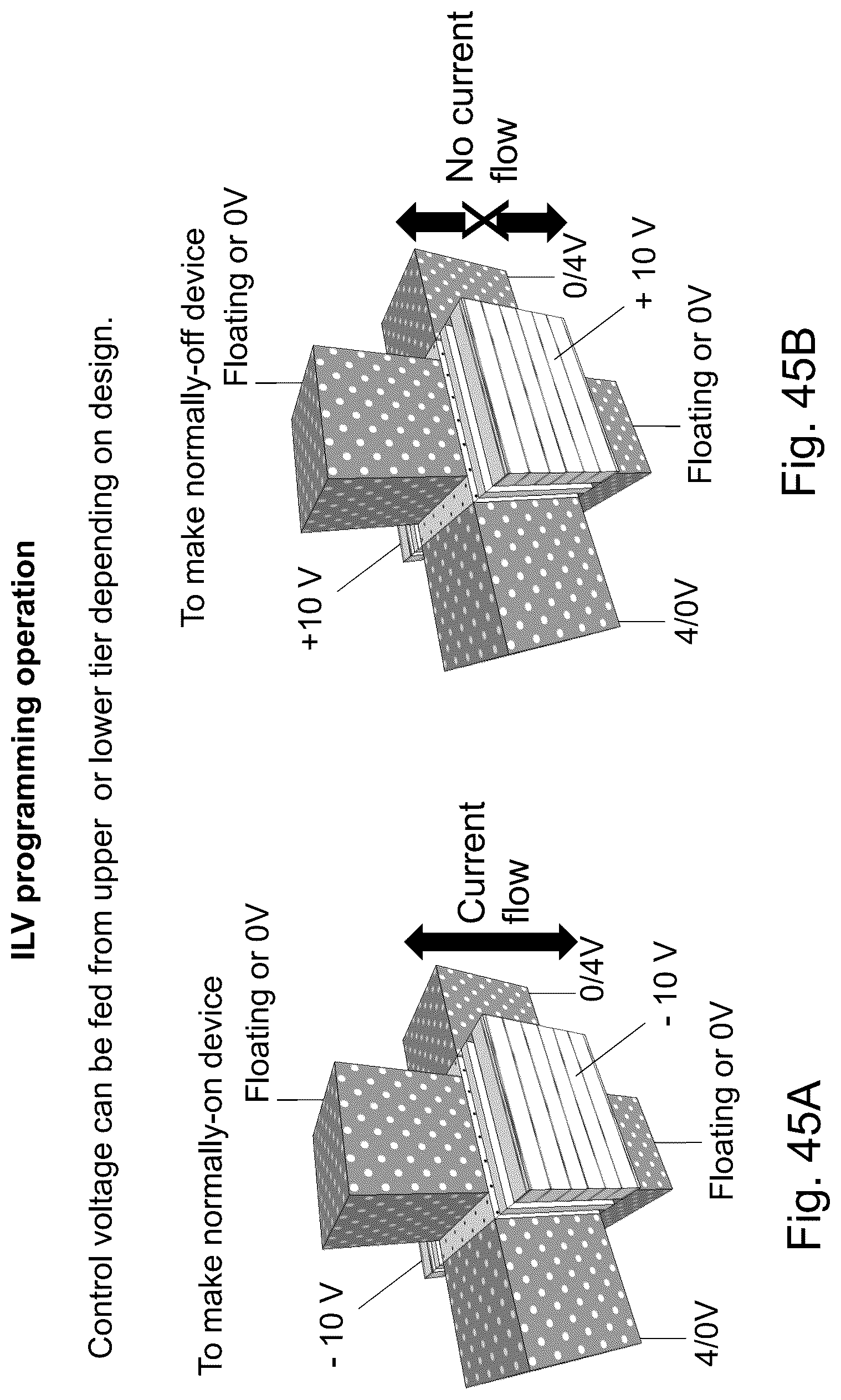 [0261]FIG. 45A illustrates the ILV programming condition to be always on ILV by having the horizontal S/D driving a programming current through the channel and the gate pull down to a negative programming voltage to load a positive (holes) charge into the charge trap layer to have the vertical transistor always on.