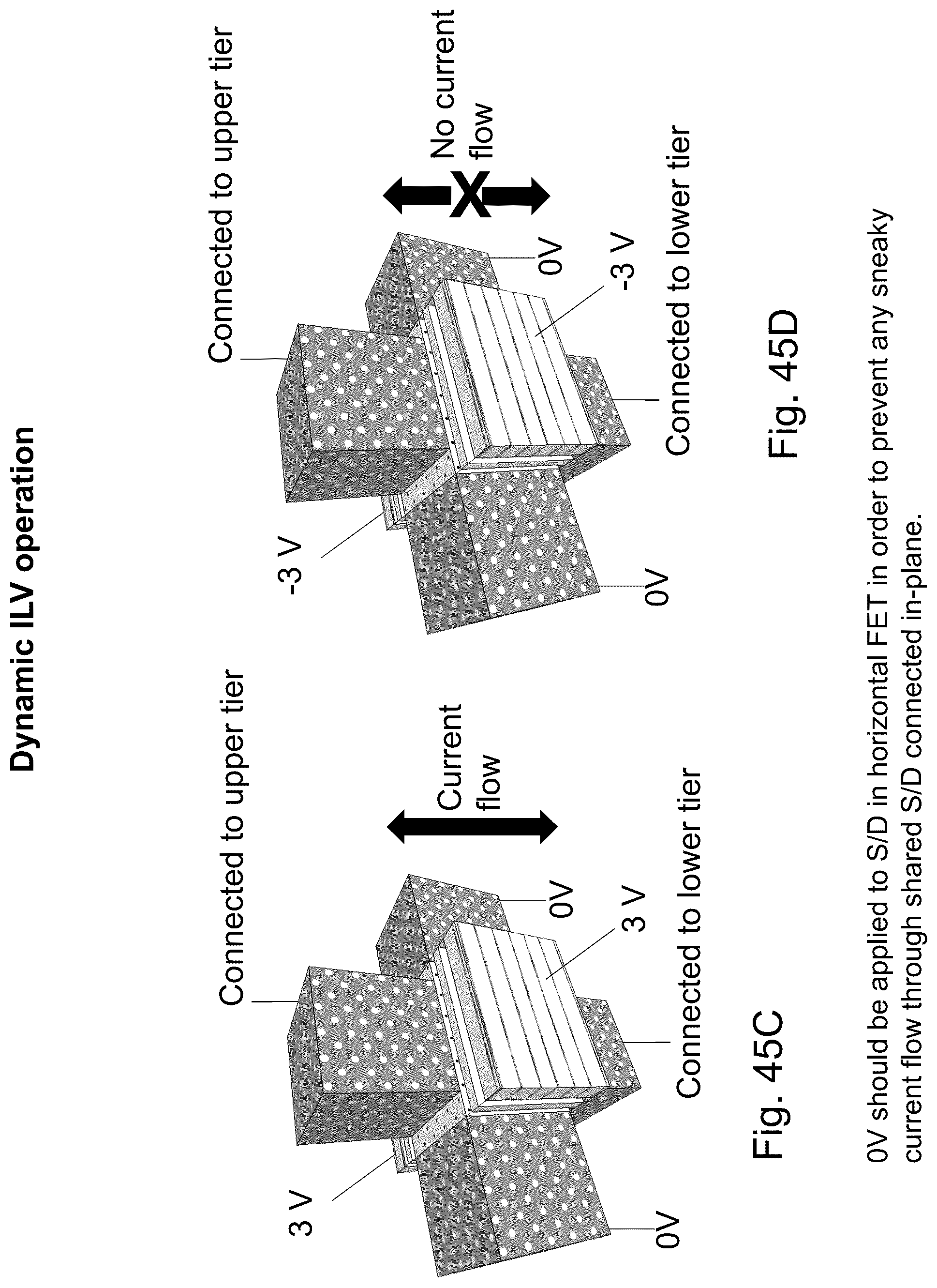 [0262]FIG. 45B illustrates the ILV programming condition to be always off ILV by having the horizontal S/D driving a programming current through the channel and the gate pull up to positive programming voltage to load a negative (electron) charge into the charge trap layer to have the vertical transistor always off.