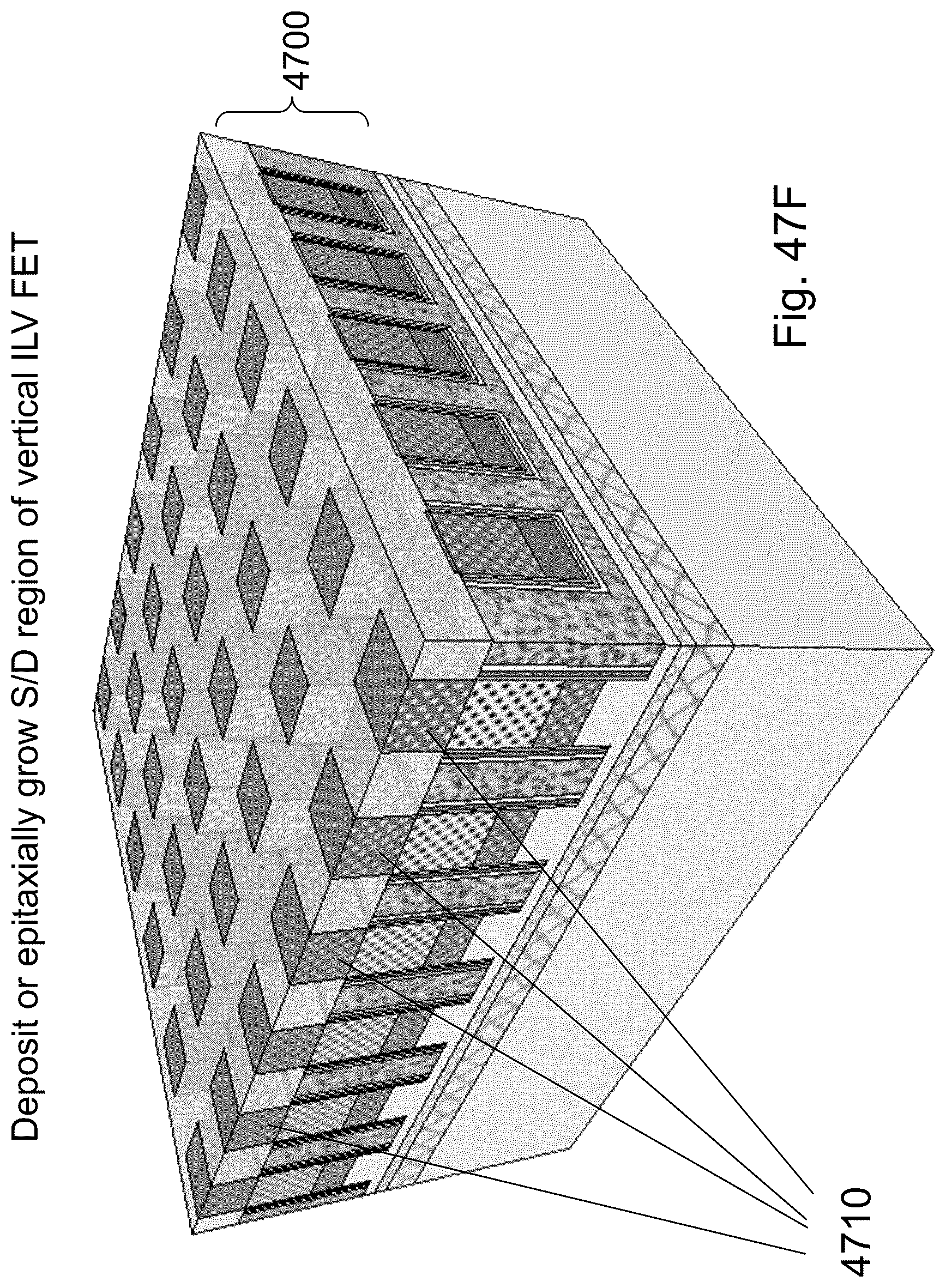 [0271]FIG. 47F illustrates completing the ILV by epitaxial grow of S/D 4710 of N+ silicon completing the ILV structures. Alternately, the bottom S/D 4710 may be formed by deposition of in-situ doped polysilicon followed by planarization and etch back. Contact metal could be added for future connection for the programmable via fabric. When forming a top and bottom S/D 4702, 4710, special care should be paid to avoid direct short between S/D arranged in horizontal FET. To do this, an insulating a spacer inside of the holes may be incorporated (not shown). Alternatively, a two-step growth such as thin p-type silicon followed by highly doped N+ silicon process may be introduced.