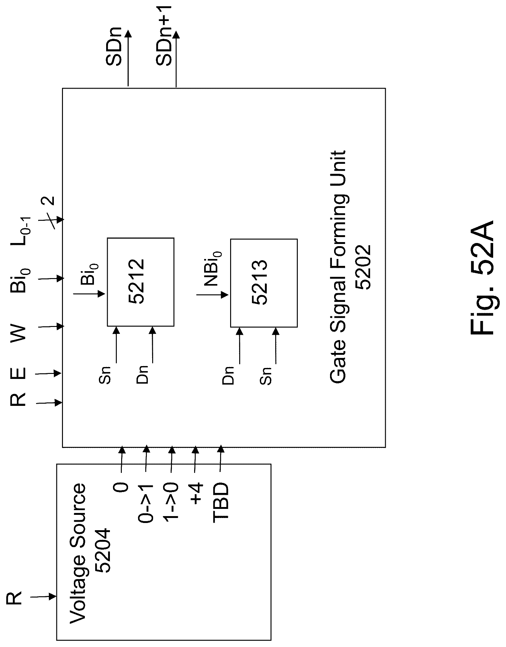 [0295]FIG. 52A also illustrates the swapping between the S/D lines for the role of Source or Drain. While physically these lines are fixed the swapping is done electronically by enabling either buffers 5212 or buffers 5213. NBi0is the inversion of signal Bi0.
