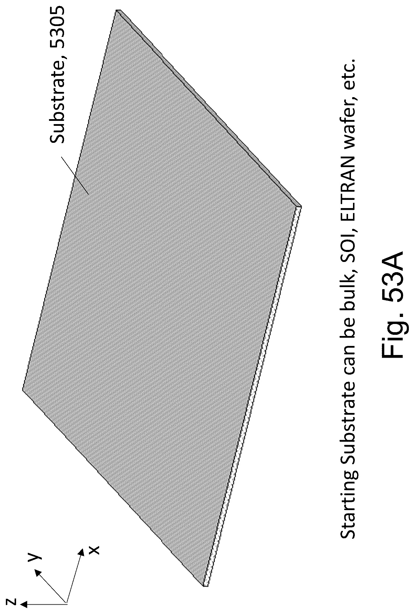 [0302]FIG. 53A illustrates a starting substrate 5305 which could be a bulk silicon substrate or thin silicon over oxide or over porous or other alternatives, for example, SiGe on silicon.