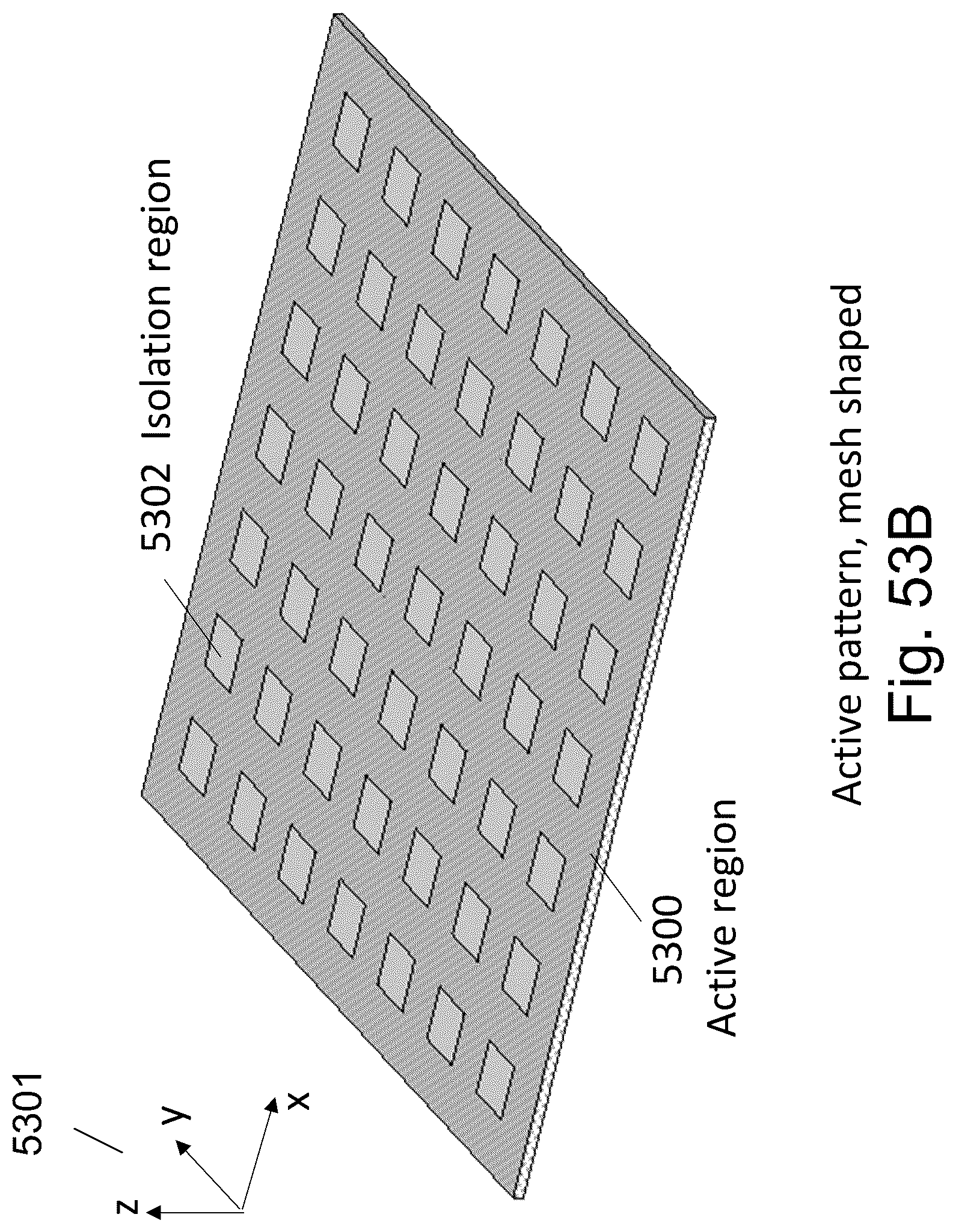 [0303]FIG. 53B illustrates starting substrate 5305 processed to form active regions 5300, which could be P type silicon, and after etching a grid or grids of isolation windows and forming isolation oxide, such as STI process, forming isolation regions 5302. For the benefit of the following description we could use directions as indicated by the direction arrows 5301.