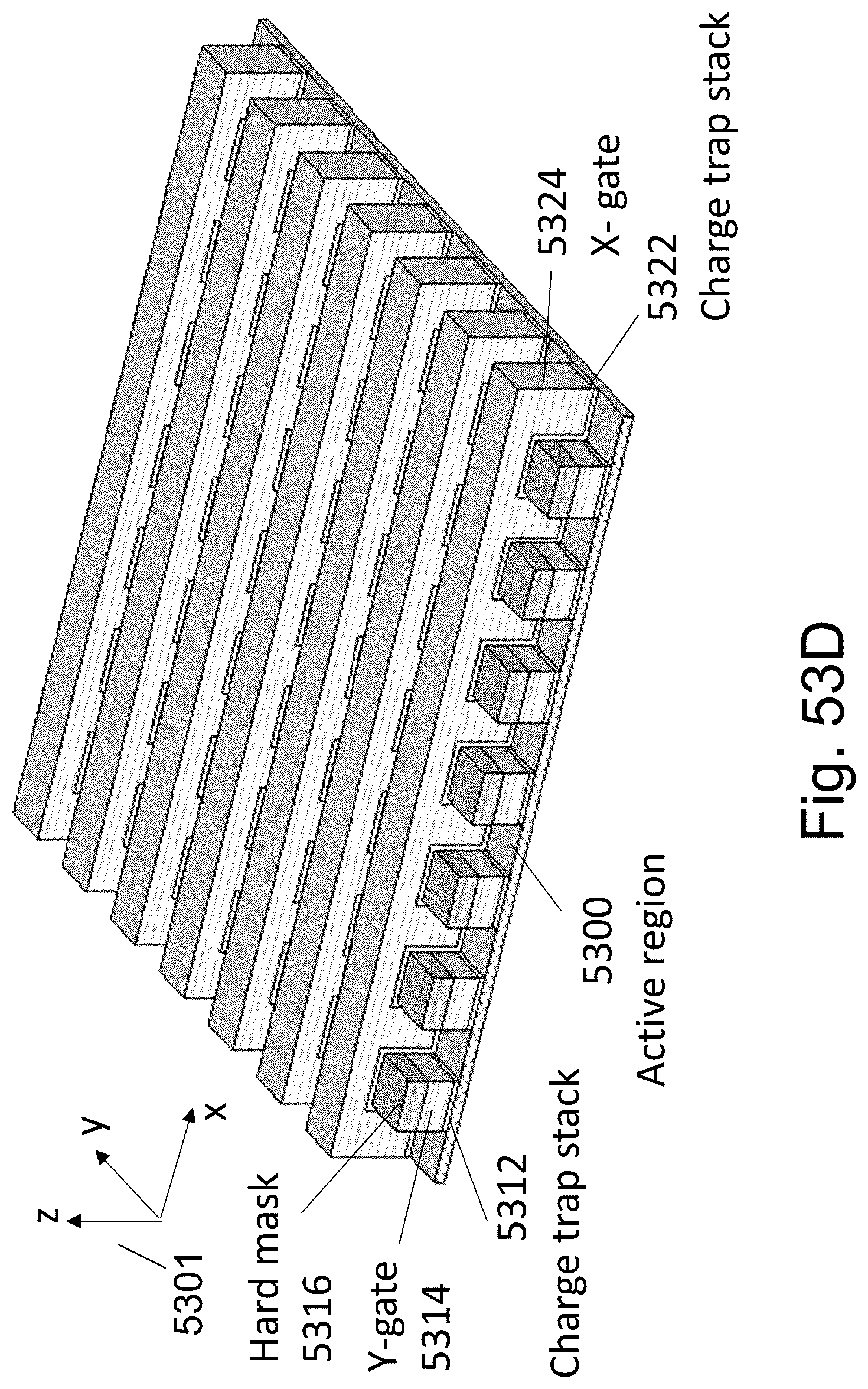 [0305]FIG. 53D illustrates the structure after formation of X-strips charge trap stack 5322 and X-gate 5324 in the X direction overlaying the Y-strips charge trap stack 5312, Y-gates 5314, and hard mask 5316 forming a Checker board like channel and gate structure. The X-strips may include second O/N/O-X charge trap stack 5322 covered by X-gate 5324. It should be noted that the X strips should be made a bit smaller than the isolation windows 5302 leaving also some window edges at their sides.