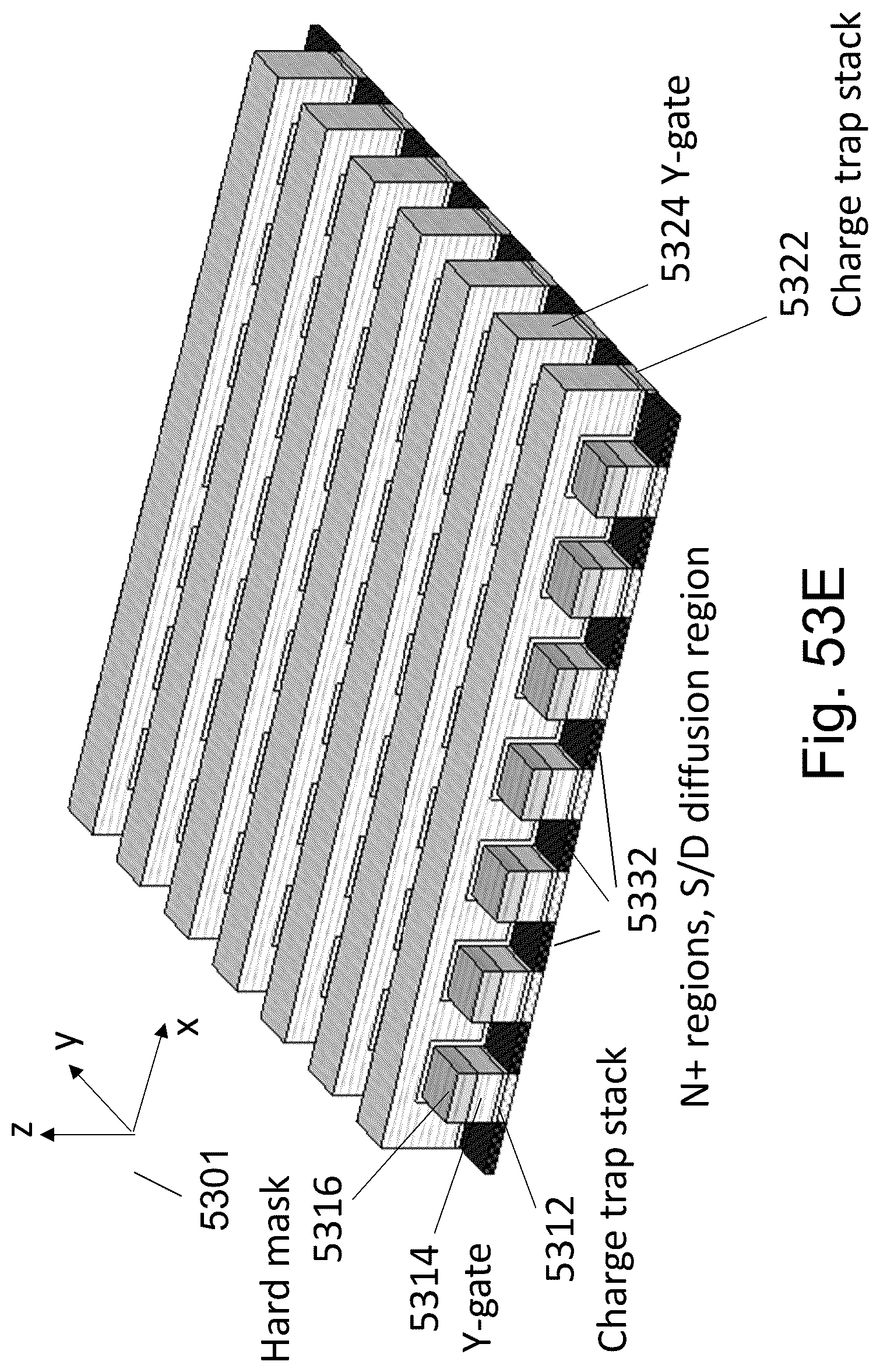 [0306]FIG. 53E illustrates the structure after ion implant step to form N+ regions 5332 in all the uncovered regions of the substrate 5300. The N+ regions 5332 may be formed in the intersection regions of the active substrate 5300. These N+ regions may serve as source and drains (S/D) for the respective transistors completing the Checker board Fabric. The fabric could use junction-less transistors if the channel thickness is made thin enough, such as less than 20 nm, for which the substrate could be made from N+ silicon or P+ silicon without the need for the ion implant step for the source and drain (S/D). The substrate could be made thicker but narrow such as the body of a FinFET. The proper modification of the channel side walls could be also be used allowing the fabric to be use as a memory fabric as well. For programmable logic, use of the—Checker board Fabric—the X-gate and the Y-gate could be used to program the respective channel by charging the top surface charge trap layer based on the desired programming choice.
