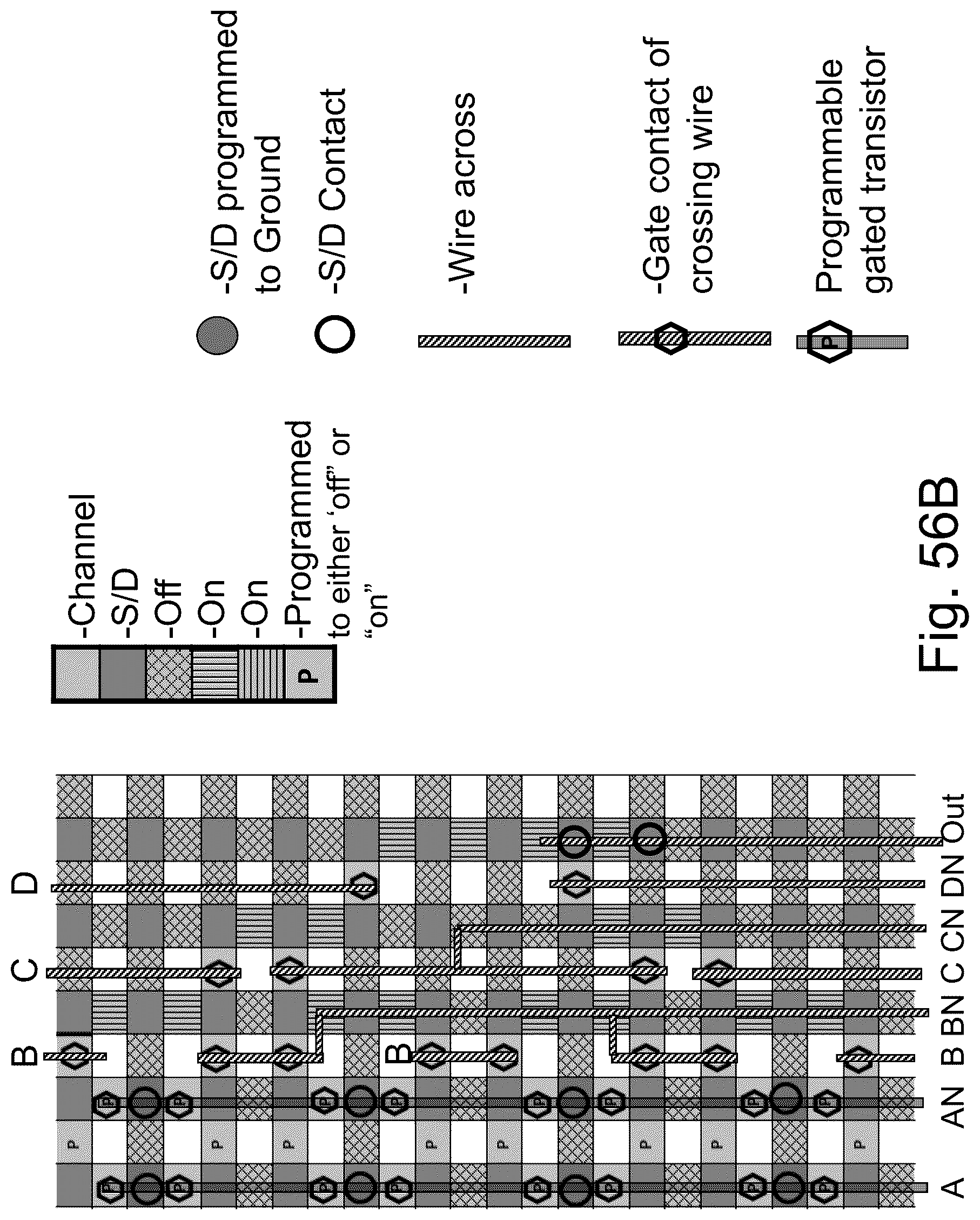 [0313]FIG. 56B also utilizes a programmed (P) gated transistor. Such allows the program to leave the transistor controlled by the gate signal or forcefully program the transistor to either always On or Always Off.