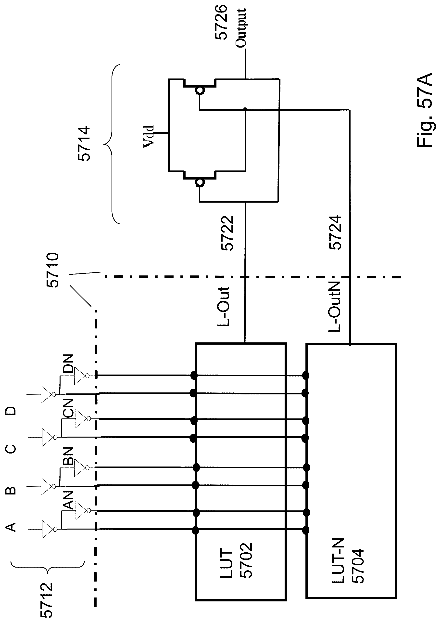 [0315]In some applications, such as in an advanced process/device node, the N type LUT circuit illustrated in FIG. 34A and FIG. 34B and the use of the pull-up-inverter signal reconstruction circuit 3401 is less than optimal. Also the domino logic clock base reconstruction circuit 3602 could be limiting. An alternative approach could be used as is illustrated FIG. 57A. It utilizes a half PMOS latch circuit 5714. The half PMOS latch circuit 5714 would have as an inputs, the output L-Out 5722 of the first LUT 5702, which could be connection path to ground—zero signal or floating line—high resistivity, and the output L-OutN 5724 of the first LUT-N 5704, which, too, could be a connection path to ground—zero signal or floating line—high resistivity. The inputs to both LUT 5702 and LUT-N 5704 are the same input signals (A, B, C, D) and their inversion (AN, BN, CN, DN) Input circuit 5712. The two LUTs are programmed to be complementing each other so if L-Out 5722 is low (‘0’) then L-OutN is high-impedance and the inverse when L-Out 5722 is high-impedance then L-OutN is low (‘0’). Accordingly the half PMOS latch circuit 5714 converts these complementing signals to a normal logic signal Output 5726 which would be low (‘0’ also called Vss) when L-Out 5722 is low and would be high (Vdd) when L-OutN is low (‘0’).