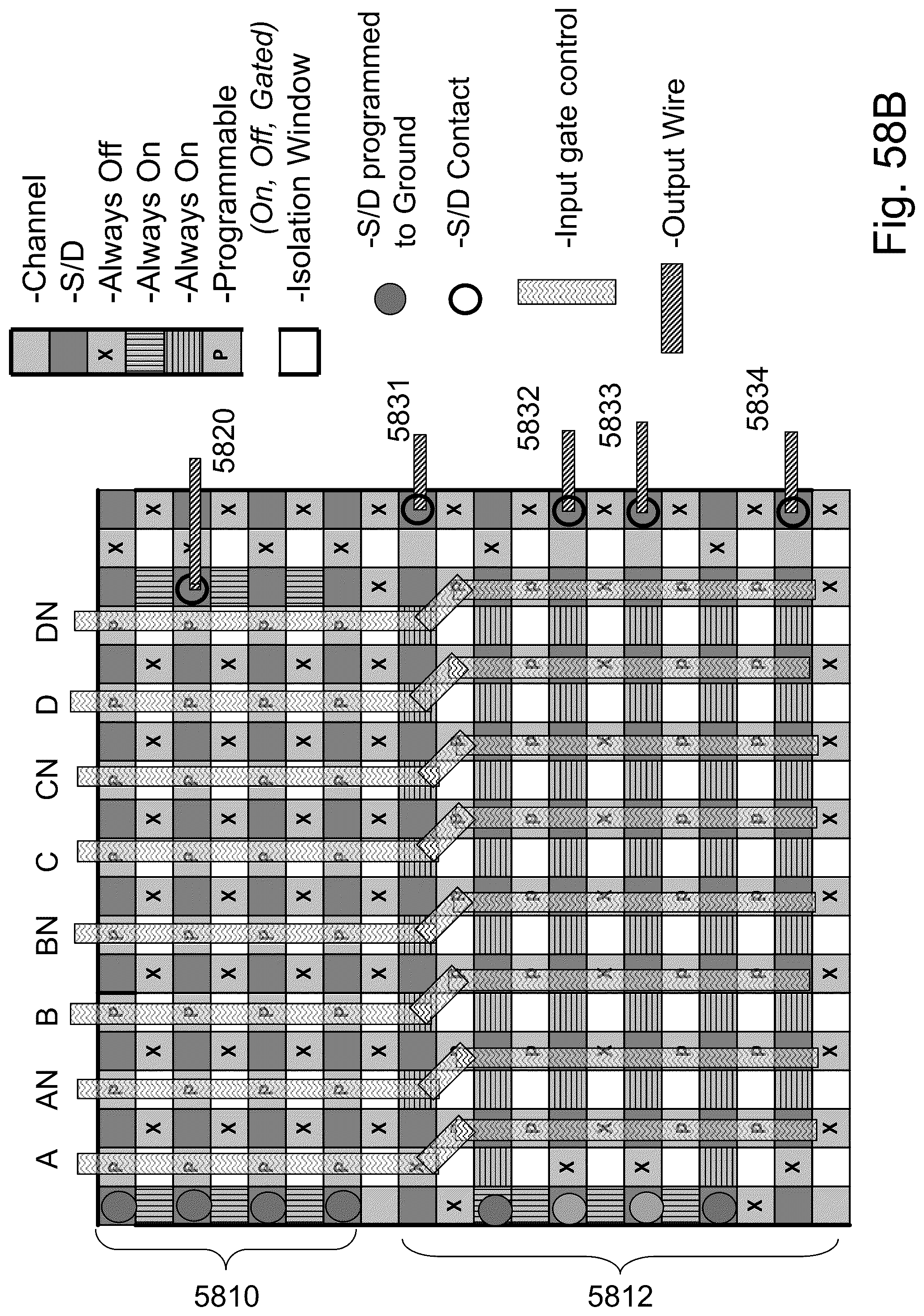 [0320]FIG. 58B illustrates the structure after adding the gate control of the inputs (A, AN, B, BN, C, CN, D, DN) so the upper portion 5810 provides the 4 NAND function AND together to the programmable NAND-Out 5820, and lower portion 5812 provides the 4 AND terms forming 4 outputs first output 15831, second output 5832, third output 5833, and fourth output 5834. These outputs may then be connected to half latch 5844 as illustrated in FIG. 58C to construct a 0/1 logic output 5846. The broken line 5840 indicate the transition from the Checker Board fabric of the NAND product output Q 5842 and the 4 AND outputs (QN1, QN2, QN3, QN4), 5845. The 4 AND outputs are connected to the gates of 4 serially connected transistors so if they are all ‘zero’ than first transistor 5852 of the half latch will turn on forcing the half latch to output 5846 a one value. This will occur in the case that the AND side product outputs a high impedance and accordingly the other transistor of the half latch second transistor 5851 would be turned off.