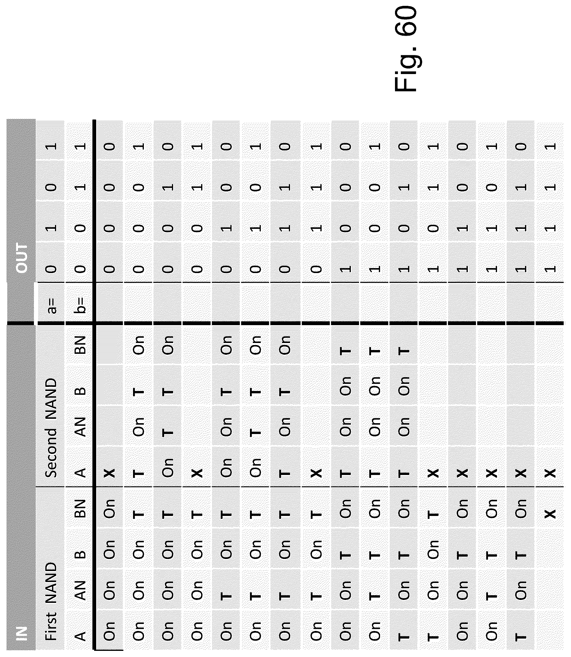 [0079]FIG. 60 is an example illustration of a table for the programming of the two NAND rows of FIG. 59 to support LUT-2 functionality;