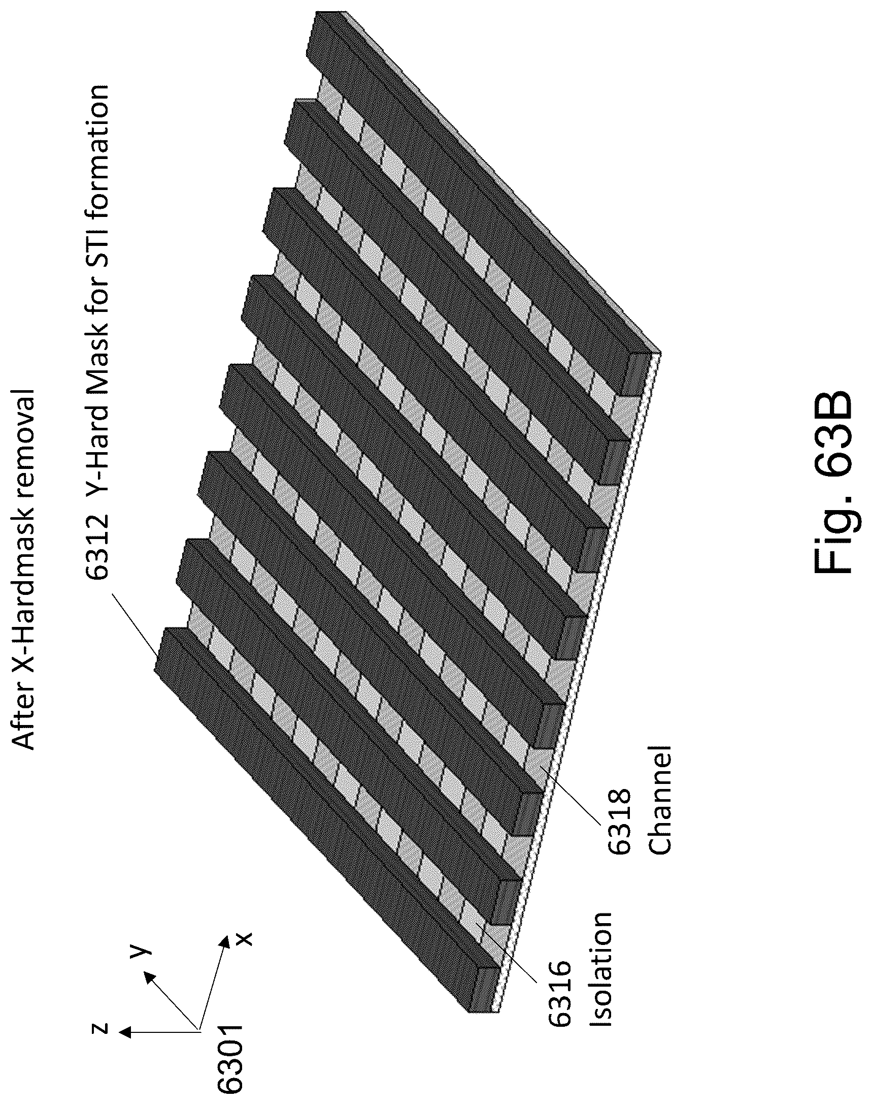 [0335]FIG. 63A illustrates the substrate such as in FIG. 53A to form hard mask strips oriented in Y direction 6302, overlaid by hard mask strips in X direction 6304. The directions are indicated by direction arrows 6301. These two hard masks are processed with materials which could allow later removal of the X direction strips 6304 without removing the Y direction strips 6302. These hard masks could shape a Shallow Trench Isolation (“STI”) process, forming isolation in the areas/regions unprotected by these strips . . . etching the substrate (may be mono-crystalline silicon) followed by an STI process.