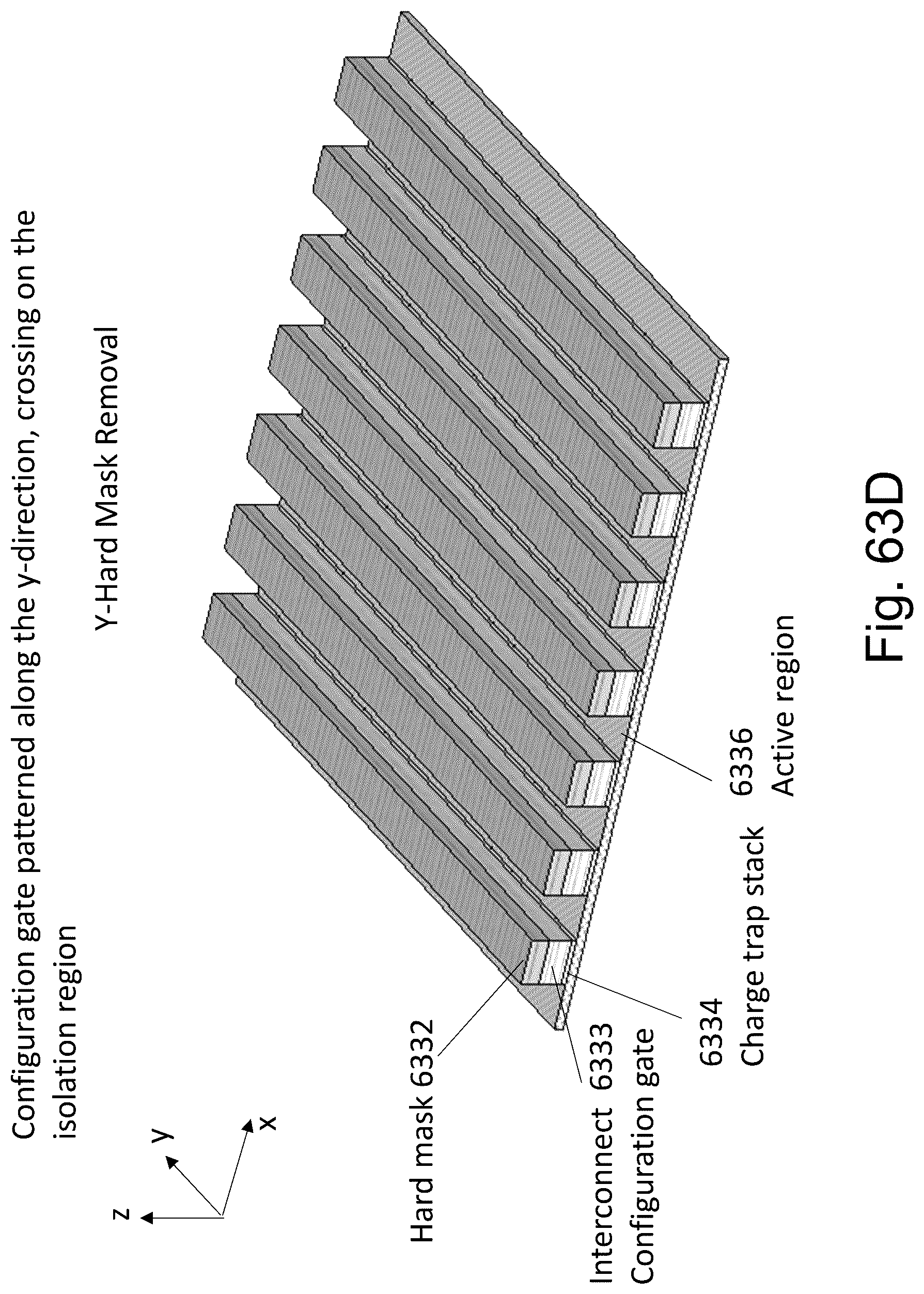 [0338]FIG. 63D illustrates the structure after removing the Y direction hard mask strips 6312 and exposing the channels in the Y direction 6336. The formed O/N/O stack 6323 could include charge trap stack 6334, gates 6333 and third hard mask 6332 to protect it from following steps and provide additional isolation.