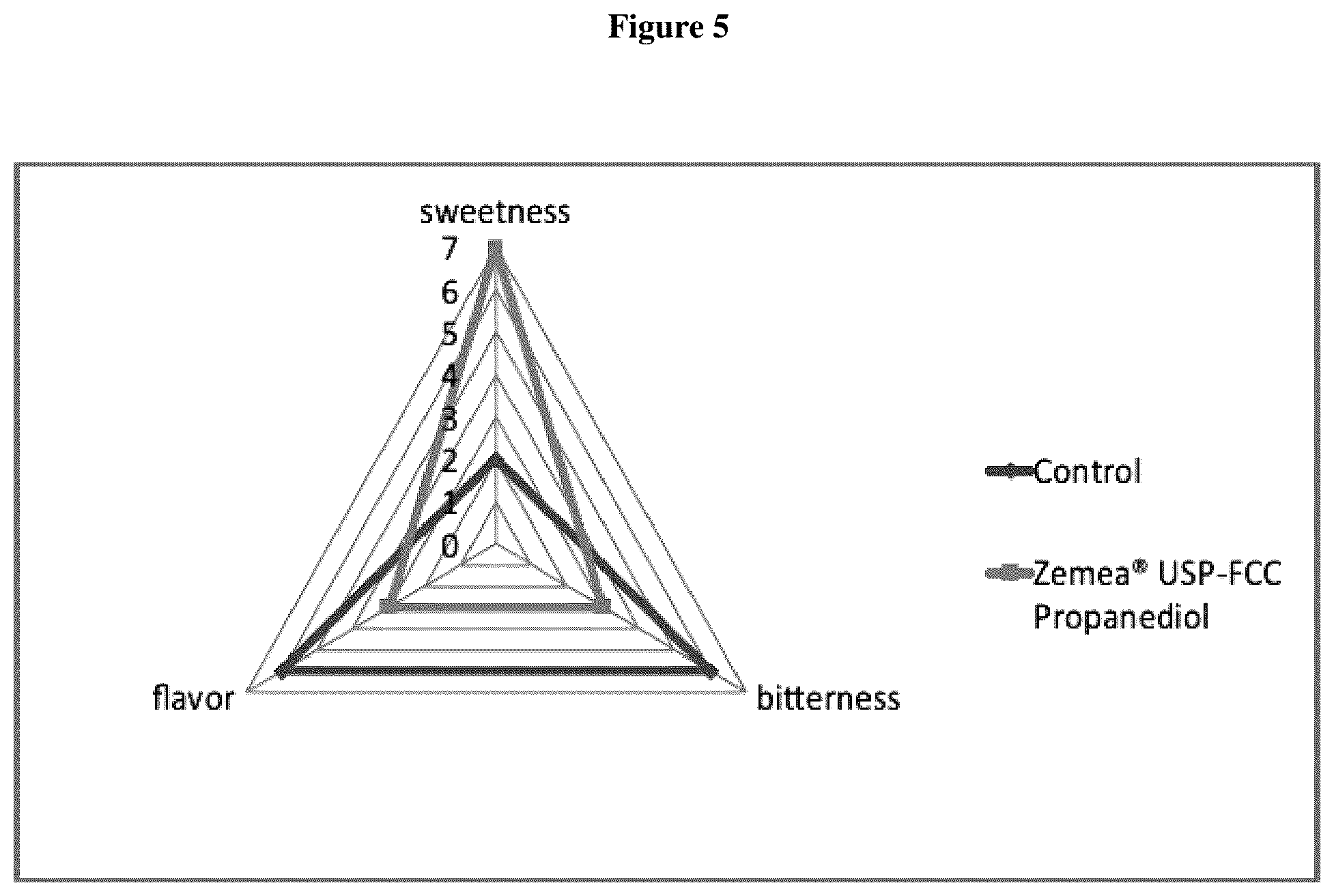 Ingredients for Experiments Cane sugar (sucrose) (Domino, premium pure cane, granulated sugar in yellow box) HFCS55, Cargill, Lot #D050744, 3/21/22, Isoclear 55 HFCS. Agave syrup, lidea Organic Premium Light, 75 brix, 80% fructose+15% glucose, LP160920. RA97%, Sweet Green Field/T&L, Sweetesse, Lot 3100071, Feb. 5, 2021) Monk fruit Mogroside-V 55%, by Layn (lot #MOV03-21111901) Sucralose syrup 25% (T&L, 25% sucralose by weight, Lot #21193011. 1 g syrup=0.25 g pure sucralose) Erythritol (Cargill, STD Gran, 3/14/22, 3 years, batch #0022289921) Allulose syrup 95% (T&L, 95% so 1 g=0.95 g allulose, Lot #YQ21L91243, made Sep. 1, 2021) (3.5% recommended as beverage limit in at least 1 GRN) Tagatose (Bonumose,97%, Lot No. 19-HN9705-TAG25, Production Date Mar. 23, 2020, 250 g) (CCC=3.3 g/serving or 1.4%=can claim zero calorie) Beverages for Spiking: Bal Antioxidant Infusion Mango (Erythritol+ Harmless Harvest coconut water (natural sugars) Trop 50 No Pulp Calcium Orange Juice Drink (4.2% juice sugars, Zevia Grapefruit Citrus ( Red Bull Original (11.3% sugar) (Design to show sweetness enhancement but not bitterness blocking) 8.4 oz 250 ml. Gatorade Lemon Lime (6% sugar+dextrose) Ripple Original (3% sugar) The absolute threshold for Zemea® USP-FCC PDO in water falls between 690 ppm and 940 ppm, closer to 690 ppm. Zemea® USP-FCC PDO is tasteless at 690 ppm (FEMA, #4753, use limit for beverages). Zemea® USP-FCC Propanediol made individual ingredients and beverages less bitter and more liked. Utilized flash profile, blind tasting by N>6, as described in Example 1. Six panelists experienced in the evaluation of food and beverages screened Zemea® USP-FCC at 5, 20, and 100 ppm in a reduced sugar Paired comparison tests for bitterness were conducted on 40 untrained panelists. The reduced sugar Results The reduced sugar Adding Zemea® USP-FCC directly at 5 ppm levels to a reduced sugar orange juice matrix with Nine panelists experienced in the evaluation of food and beverages tasted three juices and two yogurts with and without the addition of Zemea USP-FCC propanediol. The nine panelists tasted the products and discussed their perceptions of the flavor. They indicated whether the test or control product in each pair was sweeter, more bitter, and had a stronger overall flavor. The plain Greek yogurt and grapefruit juice containing Zemea USP-FCC propanediol were less bitter and clearly sweeter than the corresponding control products. The vanilla yogurt and orange juice containing Zemea USP-FCC propanediol were less bitter and somewhat sweeter than the corresponding control products. Cranberry juice containing Zemea USP-FCC propanediol was less bitter and less sweet than the corresponding control product ( Six panelists experienced in the evaluation of food and beverages tasted sweeteners and commercial beverages with and without the addition of Zemea USP-FCC propanediol. The six panelists tasted the products and discussed their perceptions of the flavor. They indicated whether the test or control product in each pair was sweeter, less bitter, and/or less sour.CROSS-REFERENCE TO RELATED APPLICATIONS
