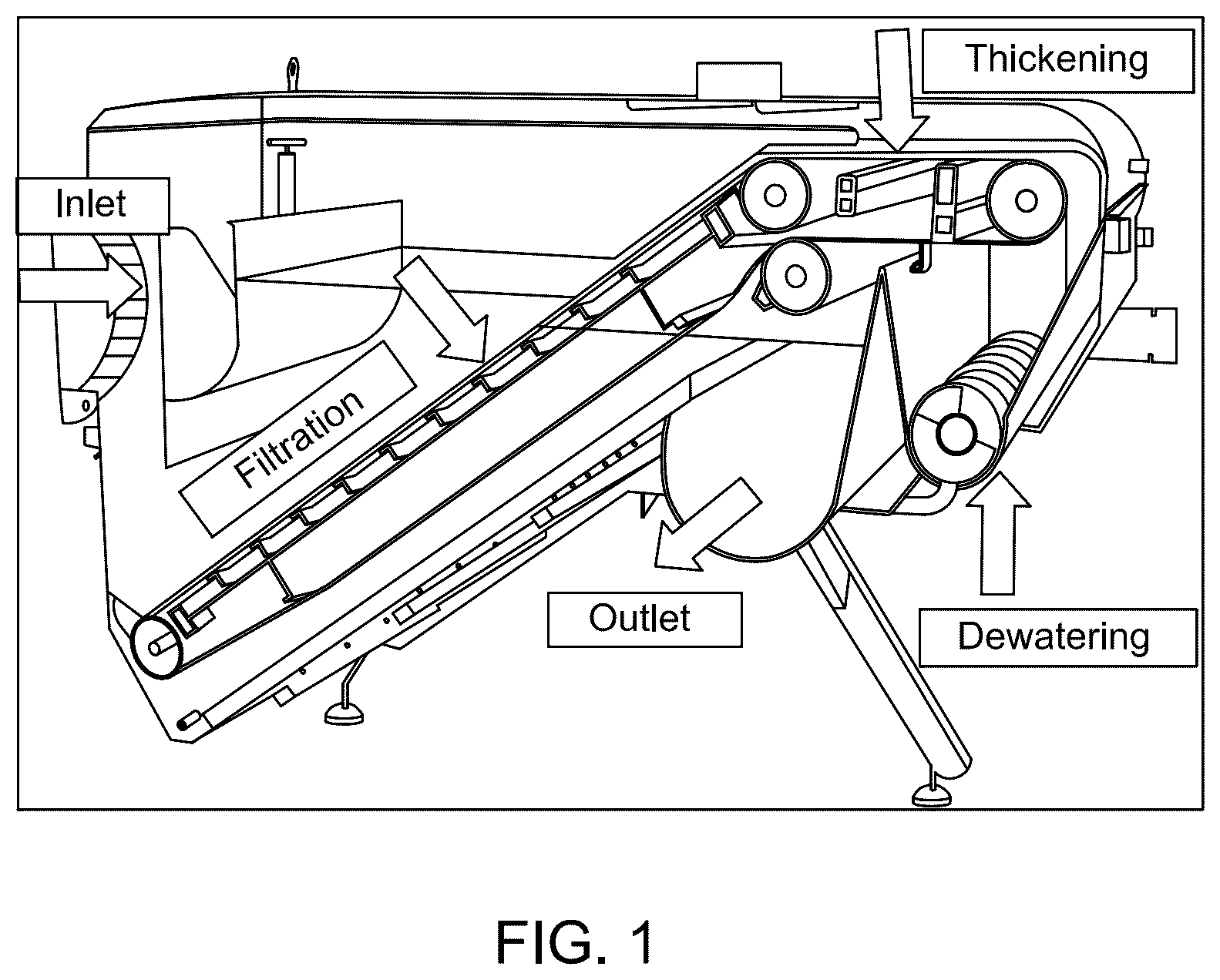 FIG. 1 is a schematic cross section showing the key functions of a rotating belt sieve.