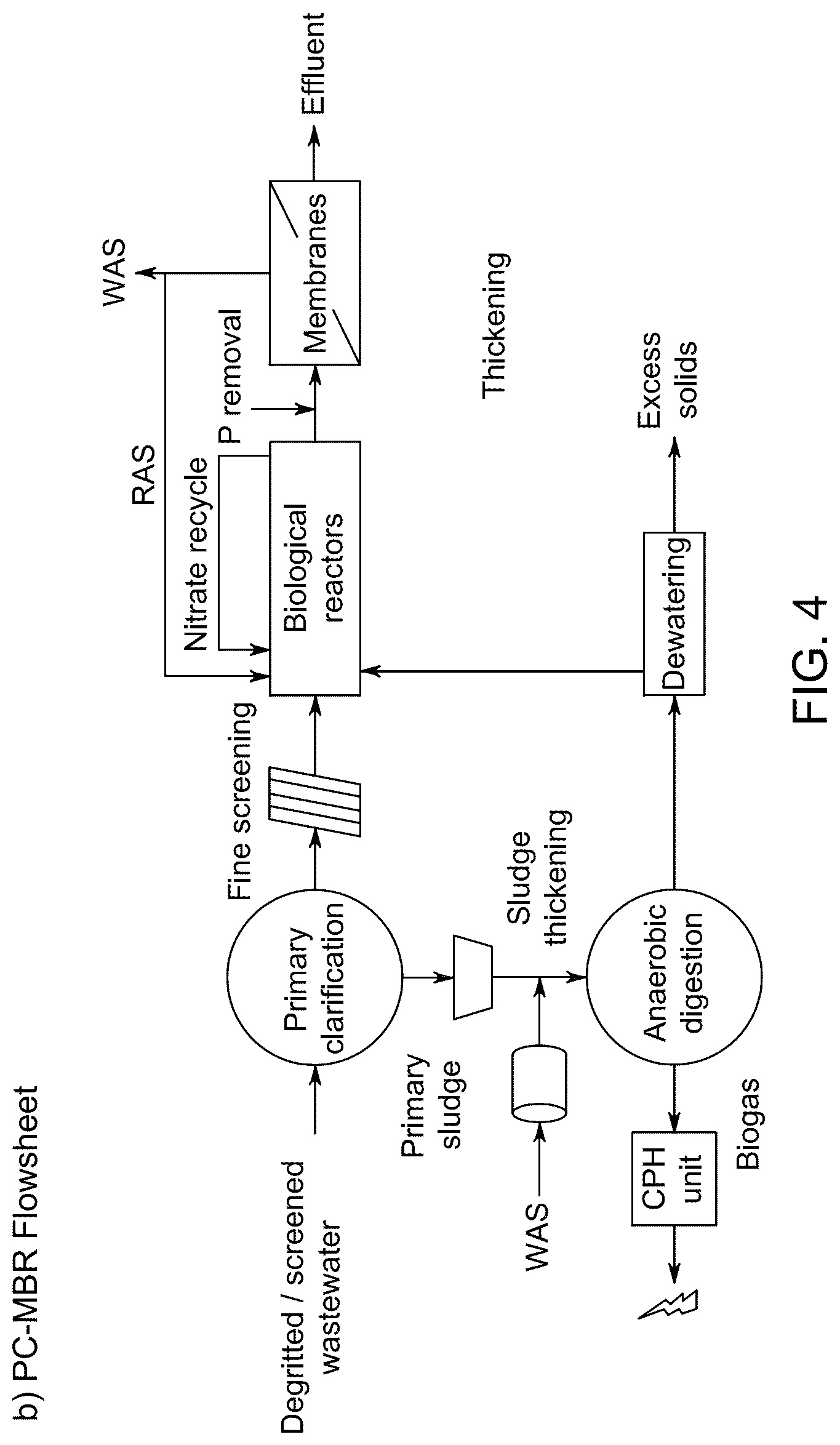 FIG. 4 contains schematic drawings of comparative MBR flowsheets.