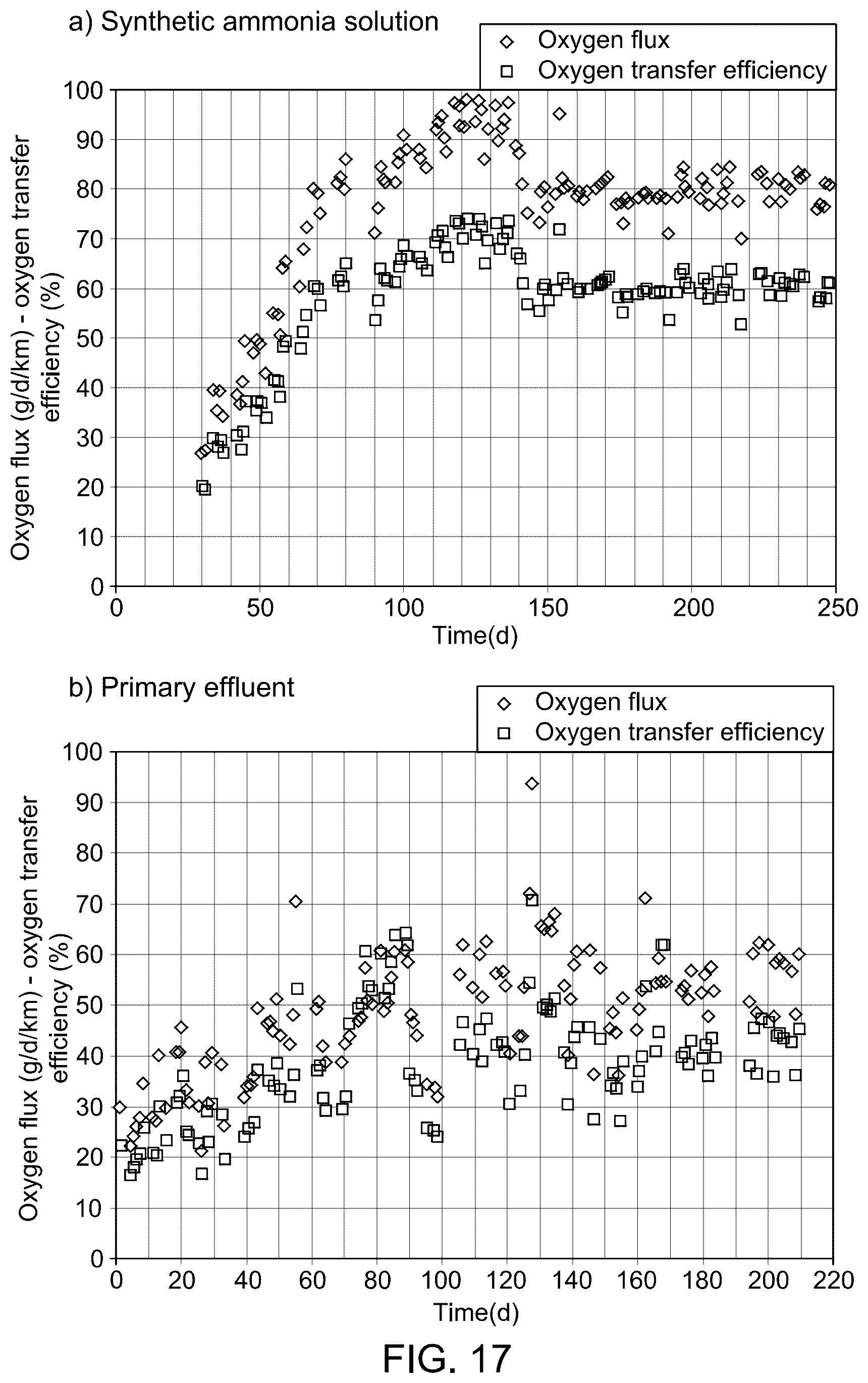 evaluated in clean water re-aeration tests, in a 250-day nitrification test using a synthetic feed solution, and treating primary effluent. Under high ammonia loading conditions, the oxygen flux reached 90-100 g O2/d/km cord (≈20 g O2/d/m2biofilm), while the nitrification rate exceeded 16 g NH4—N/d/km cord (≈3.5 g O2/d/m2biofilm). The process achieved 99% ammonia removal at a hydraulic retention time of 2.5 hours.