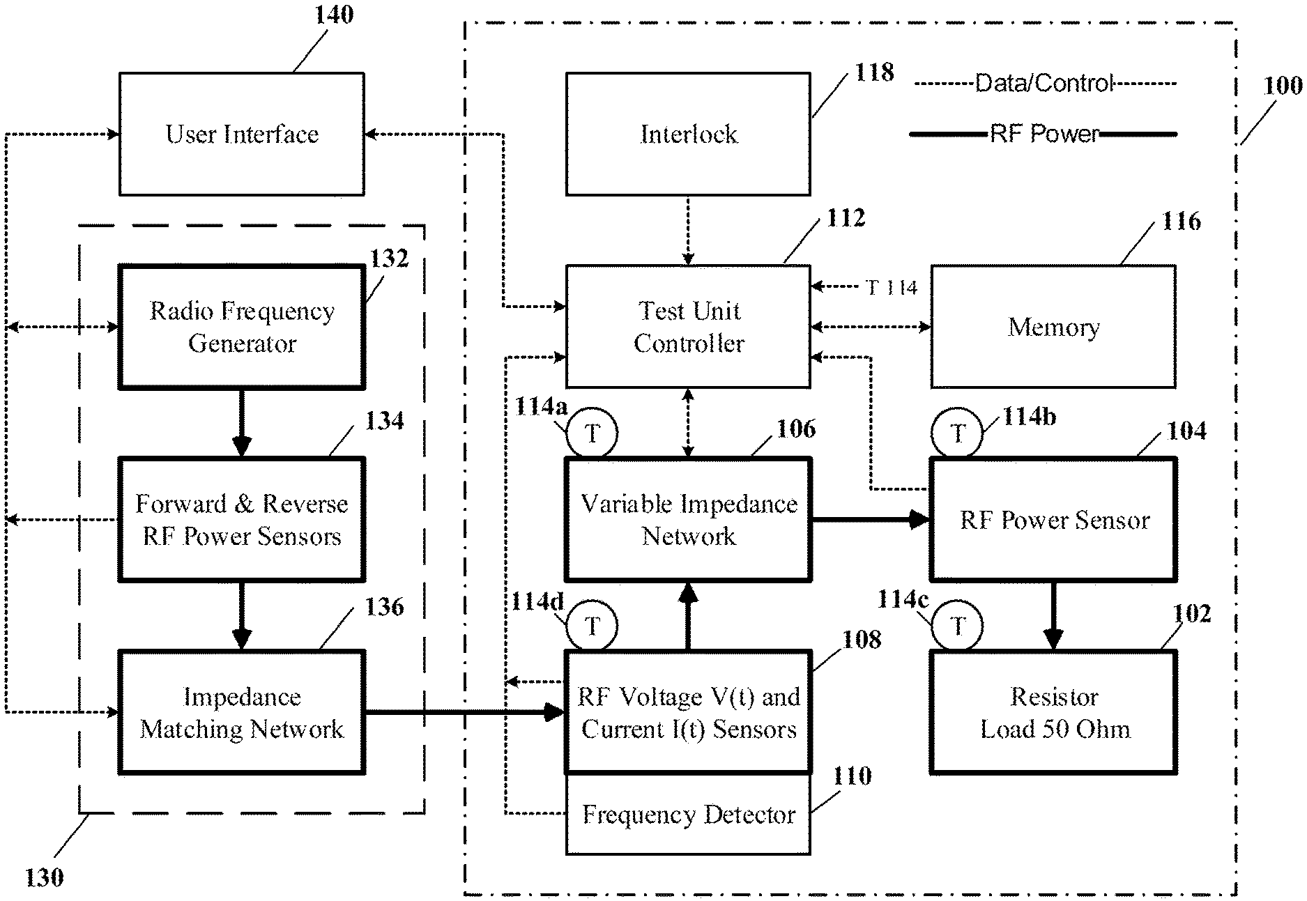 an RF generator; and an impedance matching network having an output and input coupled to an output of the RF generator; a wideband RF variable impedance test load comprising: