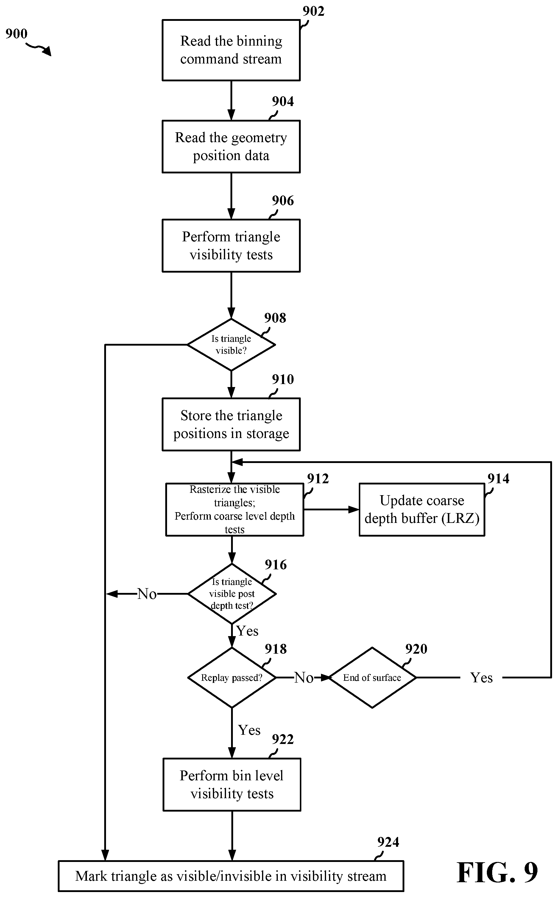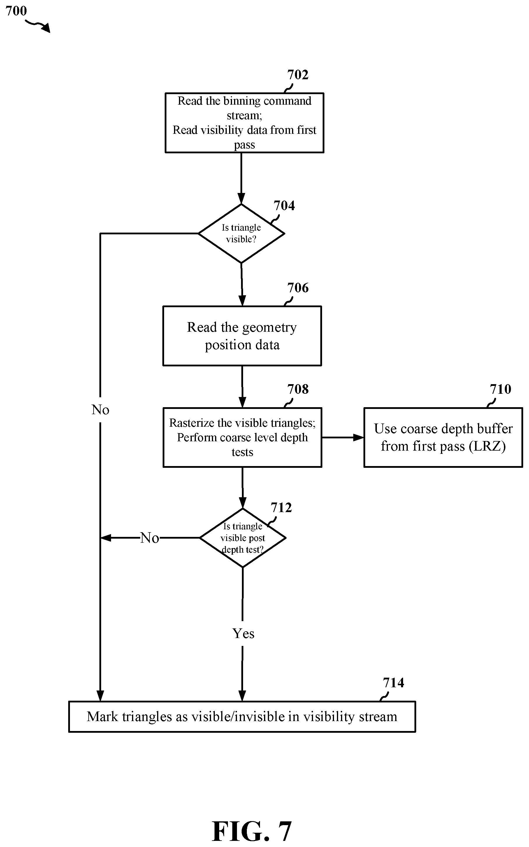 The present disclosure relates generally to processing systems, and more particularly, to one or more techniques for graphics processing. Computing devices often perform graphics and/or display processing (e.g., utilizing a graphics processing unit (GPU), a central processing unit (CPU), a display processor, etc.) to render and display visual content. Such computing devices may include, for example, computer workstations, mobile phones such as smartphones, embedded systems, personal computers, tablet computers, and video game consoles. GPUs are configured to execute a graphics processing pipeline that includes one or more processing stages, which operate together to execute graphics processing commands and output a frame. A central processing unit (CPU) may control the operation of the GPU by issuing one or more graphics processing commands to the GPU. Modern day CPUs are typically capable of executing multiple applications concurrently, each of which may need to utilize the GPU during execution. A display processor may be configured to convert digital information received from a CPU to analog values and may issue commands to a display panel for displaying the visual content. A device that provides content for visual presentation on a display may utilize a CPU, a GPU, and/or a display processor. Current graphics techniques may not address wasted work in the rendering pass when the results of the binning pass may depend on the order in which the primitives enter the pipeline and the visibility tests may not remove all the invisible primitives. There is a need for improved visibility testing techniques. The following presents a simplified summary of one or more aspects in order to provide a basic understanding of such aspects. This summary is not an extensive overview of all contemplated aspects, and is intended to neither identify key or critical elements of all aspects nor delineate the scope of any or all aspects. Its sole purpose is to present some concepts of one or more aspects in a simplified form as a prelude to the more detailed description that is presented later. In an aspect of the disclosure, a method, a computer-readable medium, and an apparatus are provided. The apparatus may perform a first binning pass associated with visibility information for each of a plurality of primitives in at least one frame. The visibility information for each of the plurality of primitives may correspond to a visible indication or an invisible indication. Each of the plurality of primitives with the visible indication may correspond to a visible set of primitives. Each of the plurality of primitives with the invisible indication may correspond to an invisible set of primitives. The apparatus may update a depth buffer based on the visibility information for all of the plurality of primitives in the at least one frame. The apparatus may perform a second binning pass for each of the visible set of primitives based on the updated depth buffer. The second binning pass may be associated with updated visibility information for each primitive in the visible set of primitives. The updated visibility information for each primitive in the visible set of primitives may correspond to an updated visible indication or an updated invisible indication. The apparatus may store at least one of the updated visibility information or updated position data for all primitives in the visible set of primitives from the second binning pass. To the accomplishment of the foregoing and related ends, the one or more aspects comprise the features hereinafter fully described and particularly pointed out in the claims. The following description and the annexed drawings set forth in detail certain illustrative features of the one or more aspects. These features are indicative, however, of but a few of the various ways in which the principles of various aspects may be employed, and this description is intended to include all such aspects and their equivalents. Various aspects of systems, apparatuses, computer program products, and methods are described more fully hereinafter with reference to the accompanying drawings. This disclosure may, however, be embodied in many different forms and should not be construed as limited to any specific structure or function presented throughout this disclosure. Rather, these aspects are provided so that this disclosure will be thorough and complete, and will fully convey the scope of this disclosure to those skilled in the art. Based on the teachings herein one skilled in the art should appreciate that the scope of this disclosure is intended to cover any aspect of the systems, apparatuses, computer program products, and methods disclosed herein, whether implemented independently of, or combined with, other aspects of the disclosure. For example, an apparatus may be implemented or a method may be practiced using any number of the aspects set forth herein. In addition, the scope of the disclosure is intended to cover such an apparatus or method which is practiced using other structure, functionality, or structure and functionality in addition to or other than the various aspects of the disclosure set forth herein. Any aspect disclosed herein may be embodied by one or more elements of a claim. Although various aspects are described herein, many variations and permutations of these aspects fall within the scope of this disclosure. Although some potential benefits and advantages of aspects of this disclosure are mentioned, the scope of this disclosure is not intended to be limited to particular benefits, uses, or objectives. Rather, aspects of this disclosure are intended to be broadly applicable to different wireless technologies, system configurations, processing systems, networks, and transmission protocols, some of which are illustrated by way of example in the figures and in the following description. The detailed description and drawings are merely illustrative of this disclosure rather than li