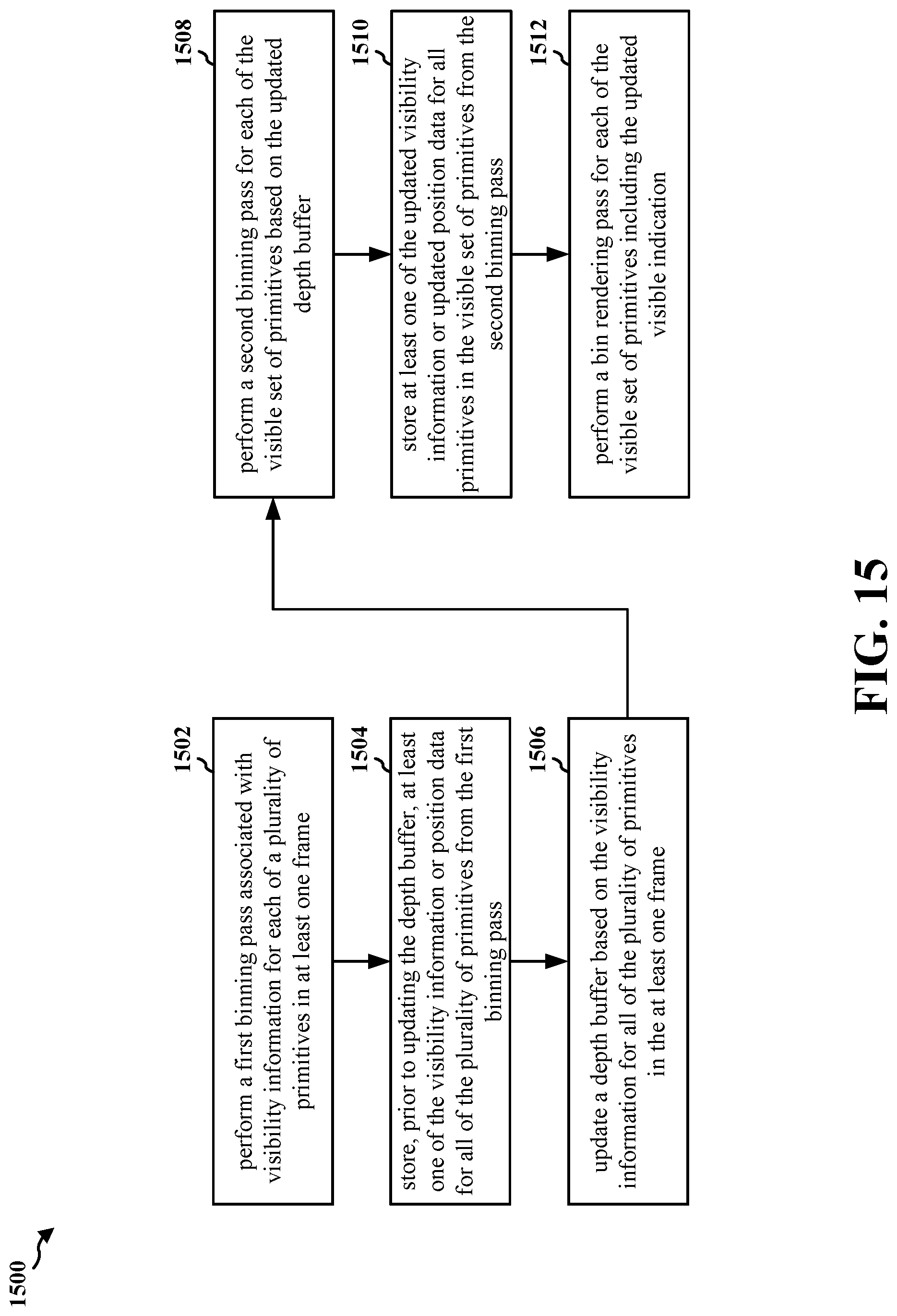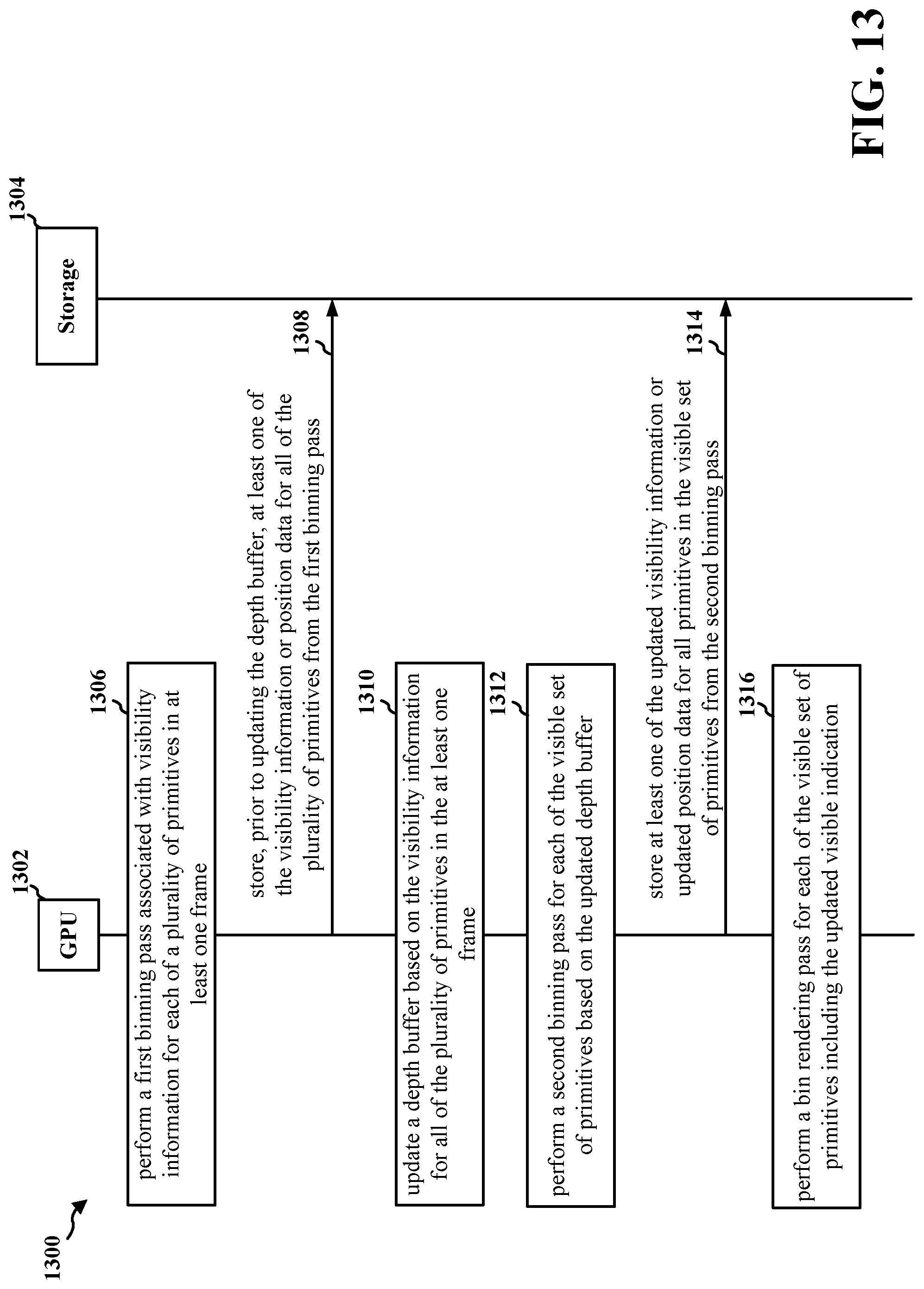 perform a first binning pass associated with visibility information for each of a plurality of primitives in at least one frame, wherein the visibility information for each of the plurality of primitives corresponds to a visible indication or an invisible indication, wherein each of the plurality of primitives with the visible indication corresponds to a visible set of primitives, wherein each of the plurality of primitives with the invisible indication corresponds to an invisible set of primitives; update a depth buffer based on the visibility information for all of the plurality of primitives in the at least one frame; perform a second binning pass for each of the visible set of primitives based on the updated depth buffer, wherein the second binning pass is associated with updated visibility information for each primitive in the visible set of primitives, wherein the updated visibility information for each primitive in the visible set of primitives corresponds to an updated visible indication or an updated invisible indication; and store at least one of the updated visibility information or updated position data for all primitives in the visible set of primitives from the second binning pass. 23. The computer-readable medium of store, prior to updating the depth buffer, at least one of the visibility information or position data for all of the plurality of primitives from the first binning pass. 24. The computer-readable medium of 25. The computer-readable medium of perform a bin rendering pass for each of the visible set of primitives including the updated visible indication, wherein the bin rendering pass is performed after storing at least one of the updated visibility information or the updated position data. 26. The computer-readable medium of 27. The computer-readable medium of 28. The computer-readable medium of 29. The computer-readable medium of 30. The computer-readable medium of