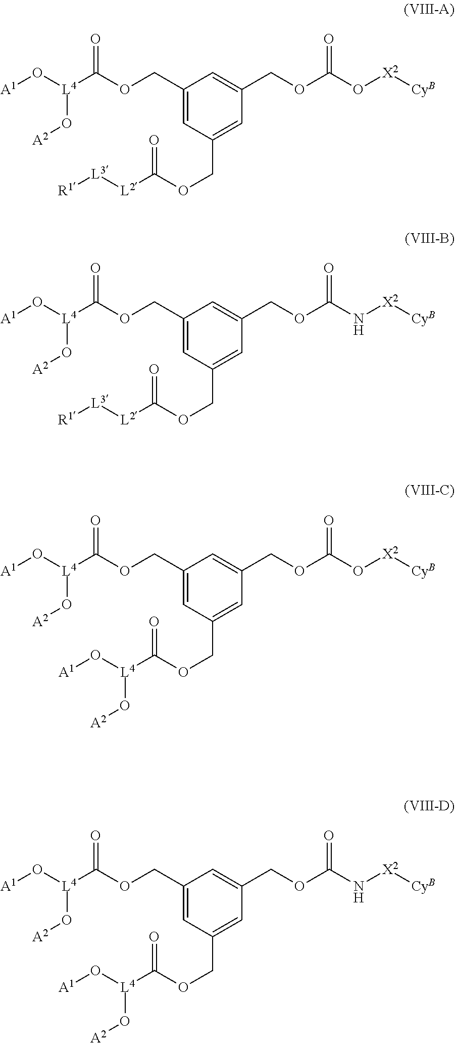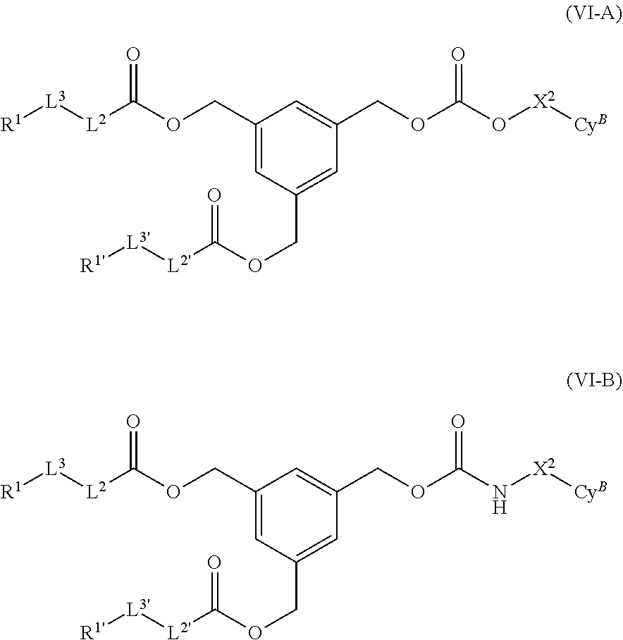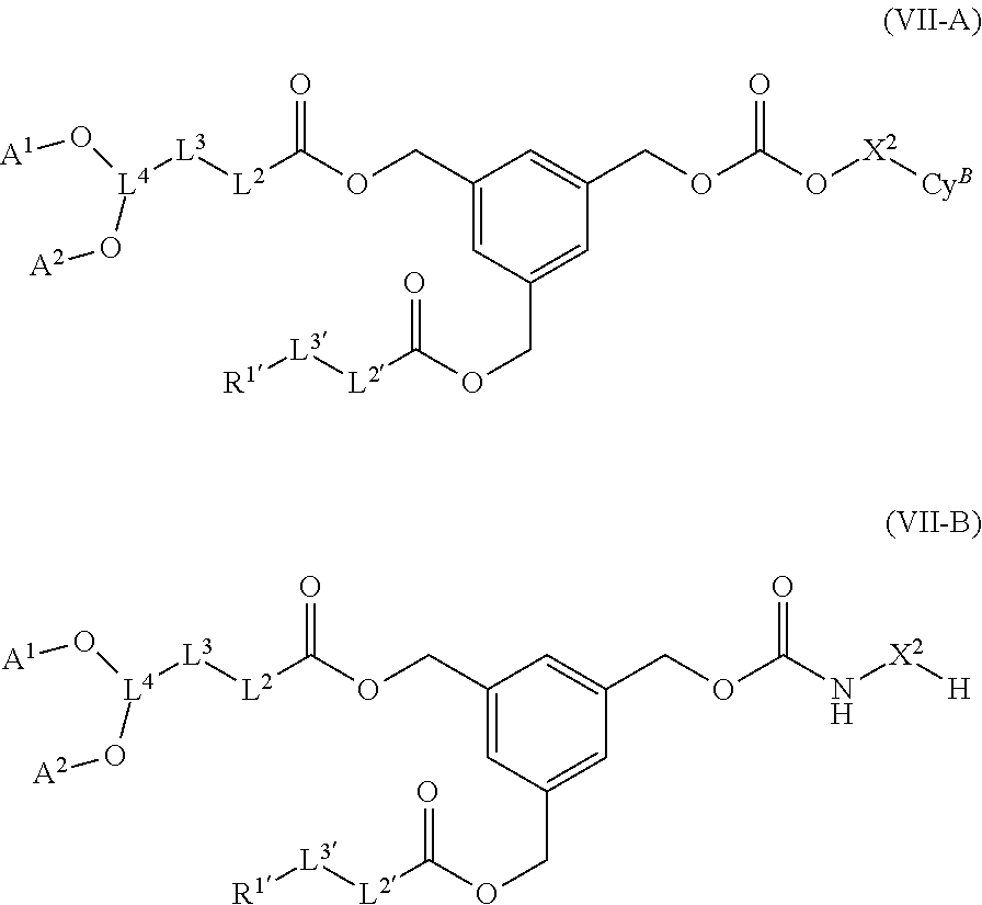 each L1and L1′ is independently —C(O)— or —C(O)O—; each L2and L2′ is independently a covalent bond, an optionally substituted bivalent saturated or unsaturated, straight or branched C1-C12hydrocarbon chain, or each CyAis independently an optionally substituted ring selected from phenylene and a 3- to 7-membered saturated or partially unsaturated carbocyclene; each m is independently 0, 1, or 2; each L3and L3′ is independently a covalent bond, —C(O)O—, —OC(O)—, —O—, or —OC(O)O—; each R1and R1′ is independently an optionally substituted group selected from a saturated or unsaturated, straight or branched C1-C20hydrocarbon chain, wherein 1-3 methylene units are optionally and independently replaced with —O— or —NR—, a 3- to 12-membered saturated or partially unsaturated carbocyclic ring, 1-adamantyl, 2-adamantyl, sterolyl, phenyl, and each L4is independently a bivalent saturated or unsaturated, straight or branched C1-C6hydrocarbon chain; each A1and A2is independently an optionally substituted C1-C20aliphatic or -L5-R5; or A1and A2, together with their intervening atoms, may form an optionally substituted ring: wherein