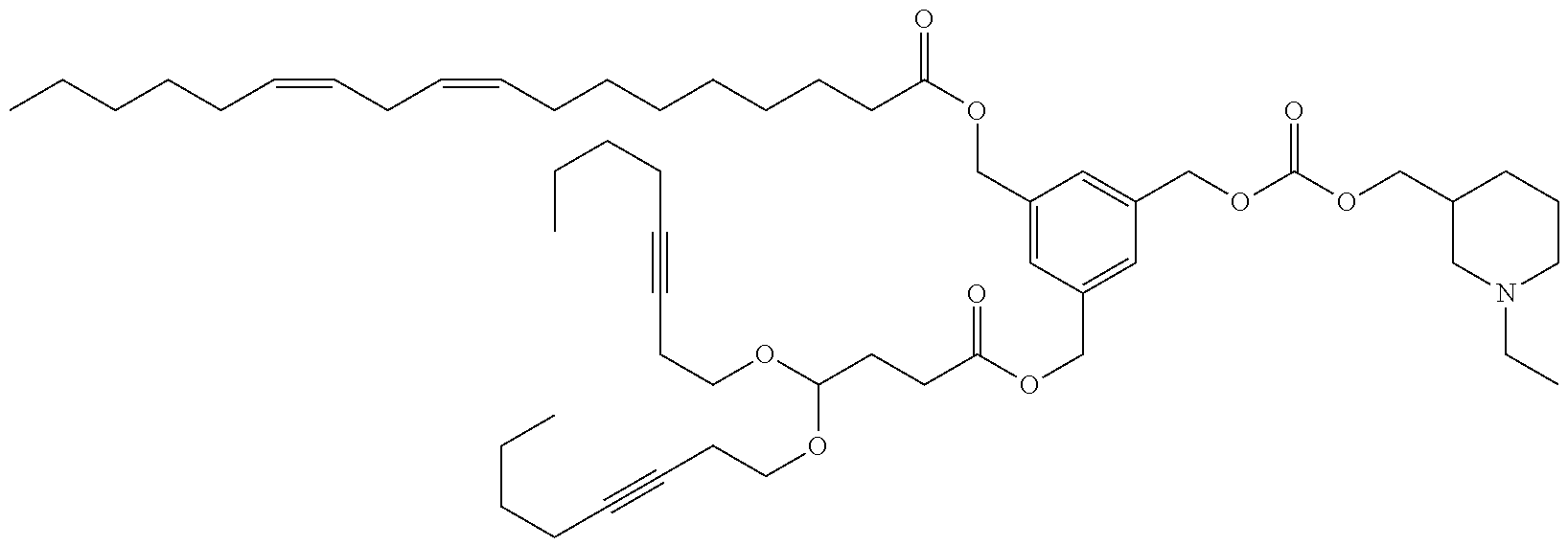 Example 5-39: 1-(3-(((4,4-bis(((Z)-oct-5-en-1-yl)oxy)butanoyl)oxy)methyl)-5-(((((1-ethylpiperidin-3-yl)methoxy)carbonyl)oxy)methyl)benzyl) 7-dodecyl heptanedioate