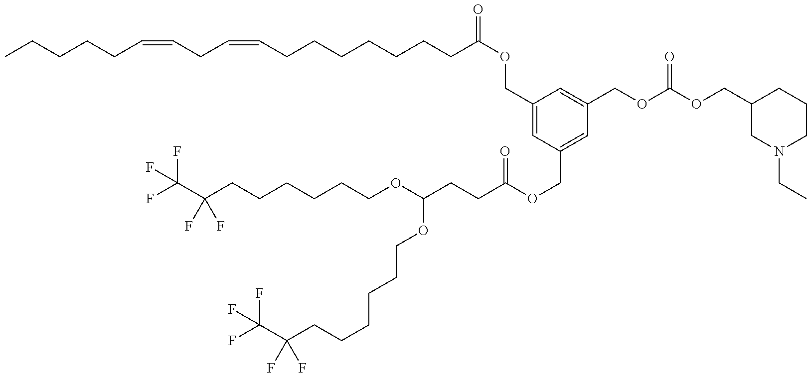 Example 5-40: (5-(((((1-ethylpiperidin-3-yl)methoxy)carbonyl)oxy)methyl)-1,3-phenylene)bis(methylene) bis(4,4-bis((7,7,8,8,8-pentafluorooctyl)oxy)butanoate)