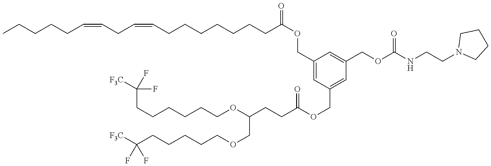 Example 5-42: 3-(((4,4-bis((7,7,8,8,8-pentafluorooctyl)oxy)butanoyl)oxy)methyl)-5-((((2-(pyrrolidin-1-yl)ethyl)carbamoyl)oxy)methyl)benzyl (9Z,12Z)-octadeca-9,12-dienoate