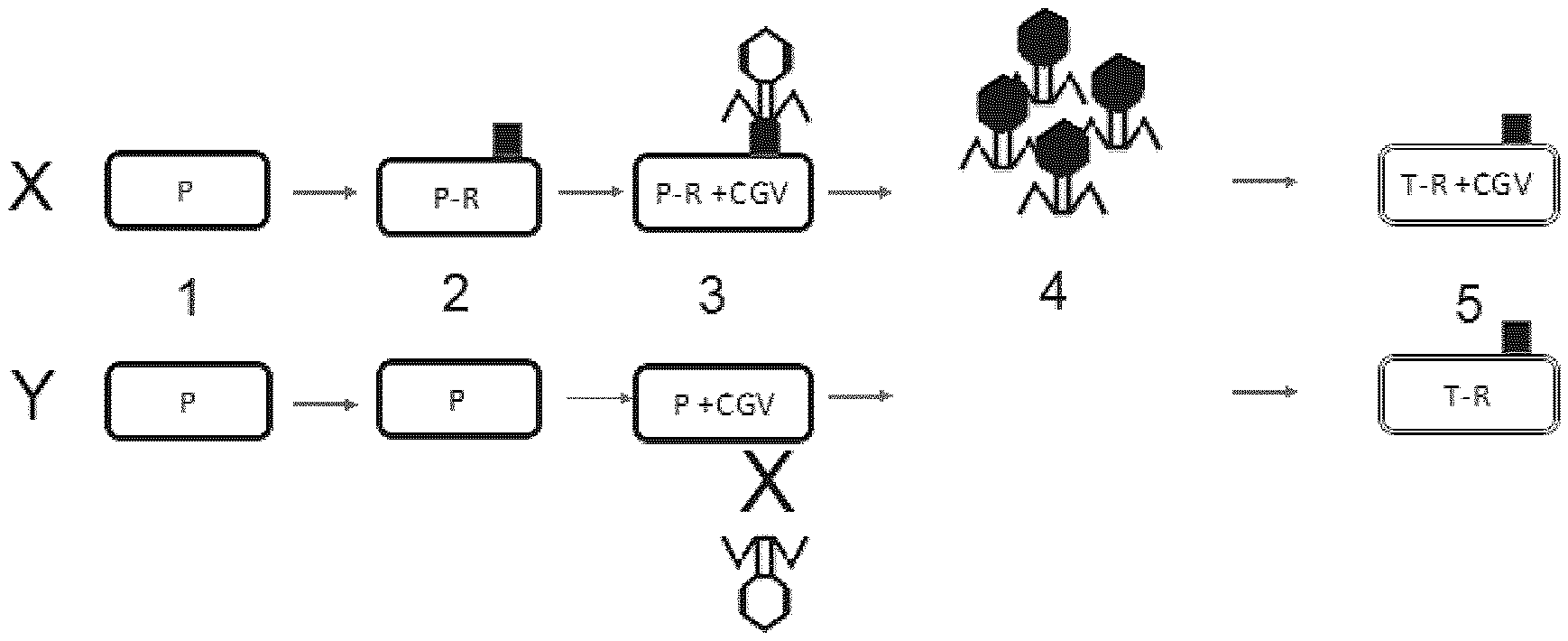 [0022]FIG. 1: FIG. 1. A bacterial production strain (1) was engineered to express a receptor (2) recognized by a helper phage (line X) while non-receptor containing cells (line Y) served as control. Both lines were then transformed with a CGV and infected with a helper phage to produce CGC-PLP (3). Only in line X harbouring the helper phage receptor, CGV-PLP was produced (4) that could be used to deliver DNA to a target cell population expressing the phage receptor