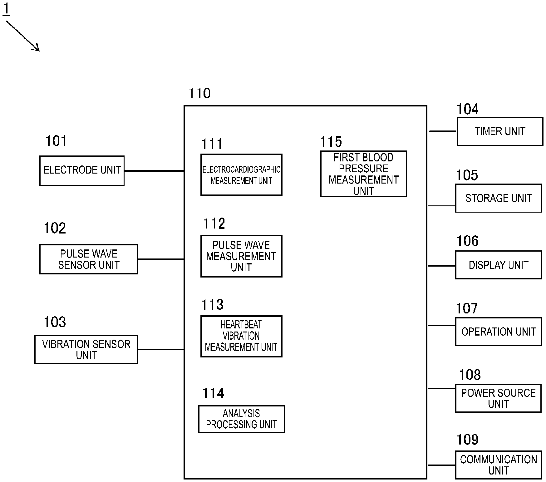 an analysis processing unit configured to calculate a pre-ejection time and a pulse transit time of the heart based on time series data of the electrocardiographic signal, time series data of the pulse wave, and time series data of the vibration caused by the beating of the heart.