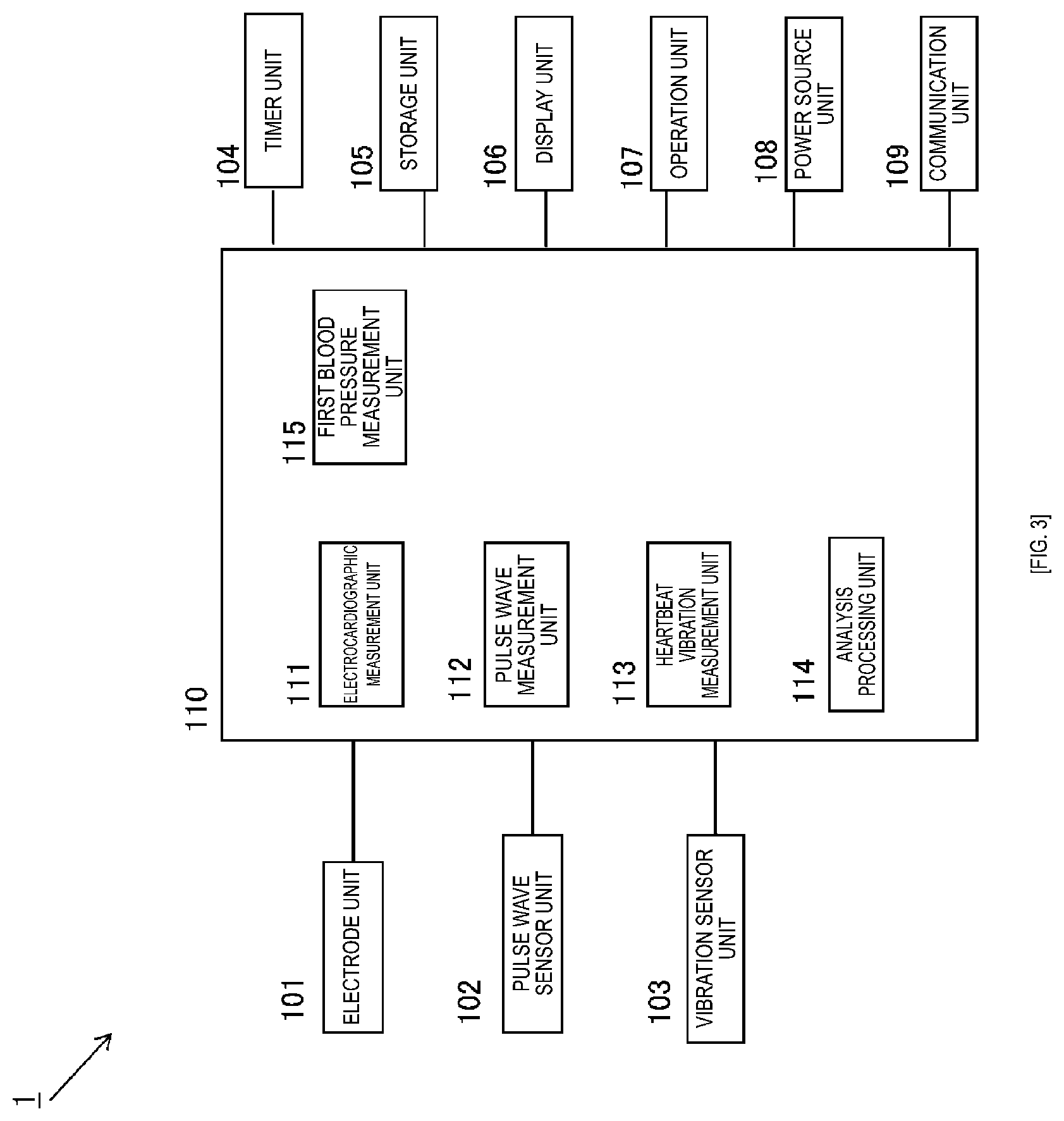 FIG. 10 is a block diagram illustrating a functional configuration of the biological information measurement device 5. As illustrated in FIG. 10, the biological information measurement device 5 includes functional units of a control unit 510, the electrode unit 101, a pulse wave sensor unit 502, a vibration sensor unit 503, a pressing cuff 504, a pump 505, a valve 506, a pressure sensor 507, the timer unit 104, the storage unit 105, a display unit 516, the operation unit 107, the power source unit 108, and the communication unit 109.