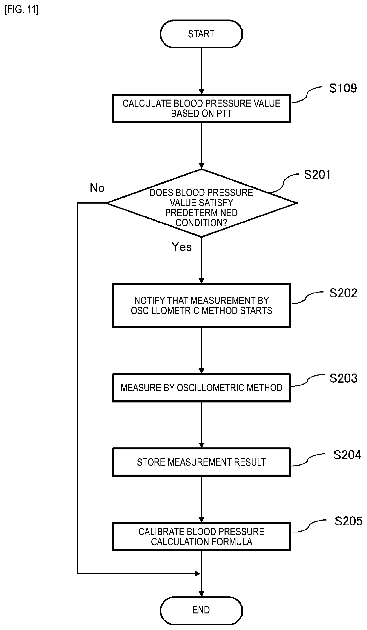 Thereafter, the control unit 510 performs processing for determining whether the measured blood pressure value by the first blood pressure measurement unit 115 satisfies a predetermined condition (S201). Examples of the predetermined condition may include a case where the measured value deviates from the upper and lower limit values over a predetermined time, a case where a fluctuating range of the measured value within a predetermined time is equal to or greater than a predetermined value, and the like. Here, when it is determined that the predetermined condition is not satisfied, the blood pressure calculation formula is not calibrated, and the flow is temporarily terminated.