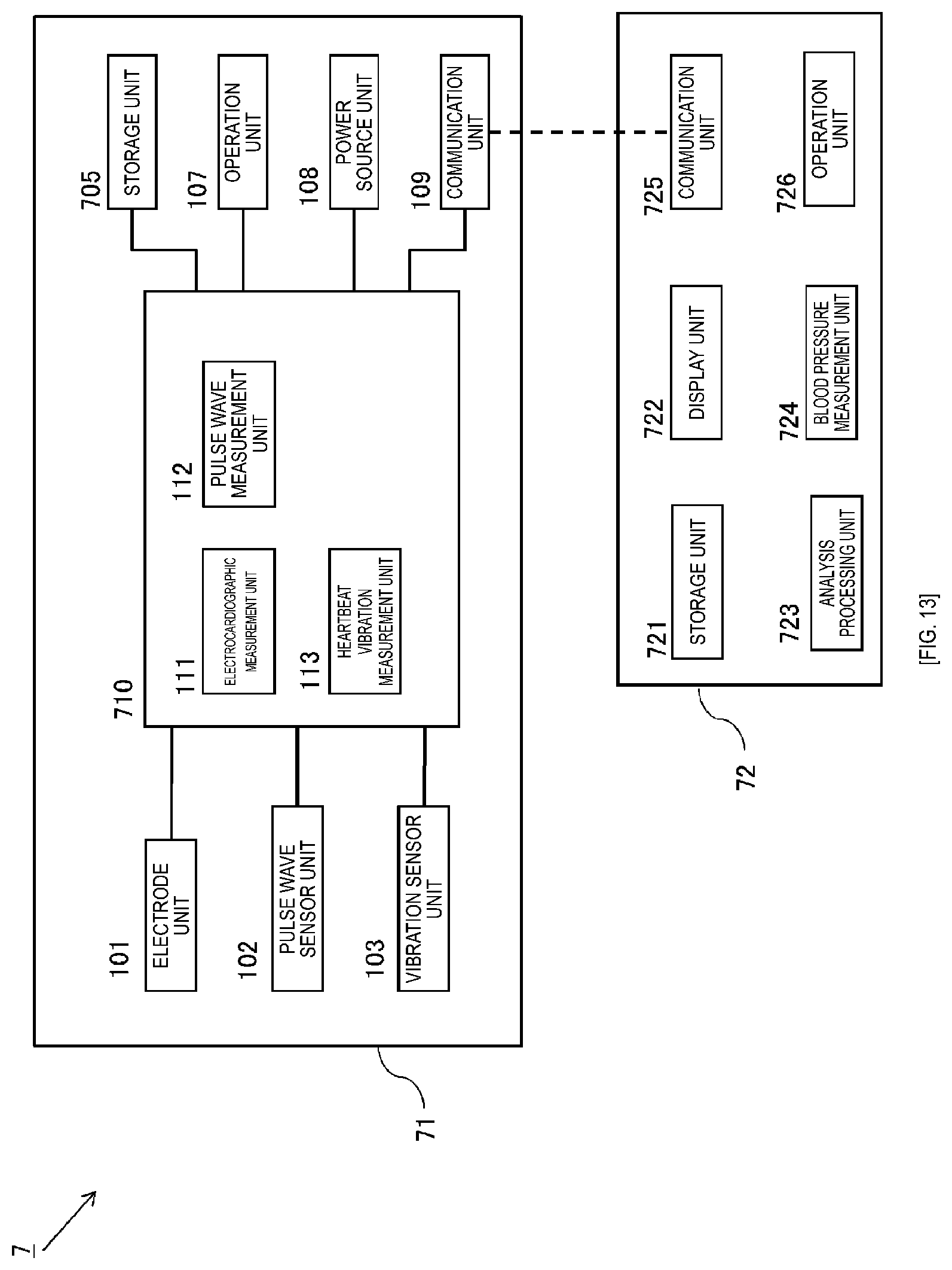 FIG. 13 is a block diagram illustrating a functional configuration of the sensor device 71 and the information processing terminal 72 of the biological information processing system 7. The sensor device 71 includes functional units of the electrode unit 101, the pulse wave sensor unit 102, the vibration sensor unit 103, a control unit 710, a storage unit 705, the operation unit 107, the power source unit 108, and the communication unit 109. Further, the control unit 710 includes, as its functional modules, the electrocardiographic measurement unit 111, the pulse wave measurement unit 112, and the heartbeat vibration measurement unit 113.