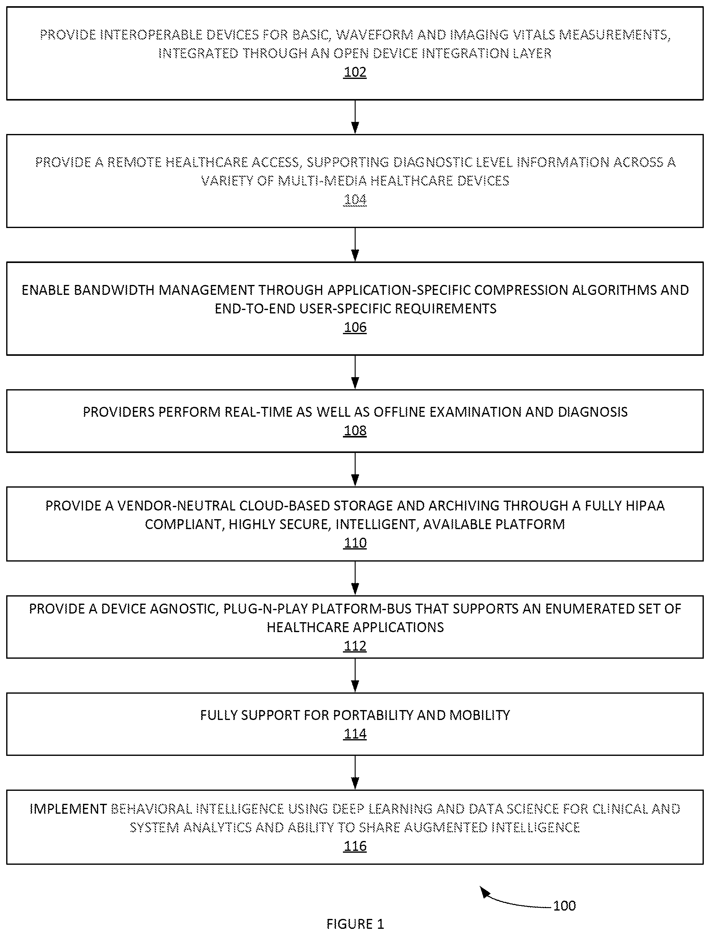 a processor; a memory containing instructions when executed on the processor, causes the processor to perform operations that: provide a set of digital medical devices, wherein the set of digital medical devices obtains a specified medical sensor information from a patient and communicates the specified medical sensor information to one or more remote entities; provide a set of telehealth devices, wherein the set of tele-health devices communicates an audio-video data of a tele-health session to the one or more remote entities; create an open Device Integration Layer (DIL), wherein the DIL communicates with the set of digital medical devices, and wherein the DIL communicates with the set of tele-health devices in a telehealth session; with the DIL, parse and translate a digital output of a medical device data of the set of digital medical devices and the set of tele-health devices; with the DIL, optimize and compress the translated digital output of the medical device data of the set of analog and digital medical devices— with the DIL, integrate the translated digital output of the set of analog and digital medical devices regardless of any output format of any of the analog and digital medical devices; provide a user interface of a medical provider's computing system, wherein an integrated data of the set of digital medical devices is represent by each type of digital medical devices in a canonical form with the audio-video data of the telehealth session, wherein the canonical form is structured in a JSON (JavaScript Object Notation) format; transport the integrated data to a vendor-neutral cloud-computing based data storage platform; archive the integrated data in a Health Insurance Portability and Accountability Act of 1996 (HIPAA)-compliant manner; and wherein an audio/video channel for consultation with the medical provider further comprises additional features comprising a file transfer protocol, a screen sharing protocol and a recording with permissions protocol, and provide a workflow and health records integration layer, wherein the workflow and health records integration layer manages a set of open APIs that map a platform data to a plurality of electronic health record (EHR) systems and wherein the workflow and health records integration layer updates a plurality of EHRs with the integrated data. 10. The computerized system of providing a transportation engine, wherein the transportation engine transmits the integrated data to one or more cloud-computing platform-based servers for distribution to a set of specified remote entities. 11. The computerized system of with the DIL, provides a device agnostic, plug-n-play platform-bus that supports an enumerated set of healthcare applications. 12. The computerized system of 13. The computerized system of 14. The computerized system of 15. The computerized system of enables a set of multiple communication channels for transmitting a device telemetry data of the set of digital medical devices and audio-video data to a medical provider computing device for real-time consultation and diagnosis.