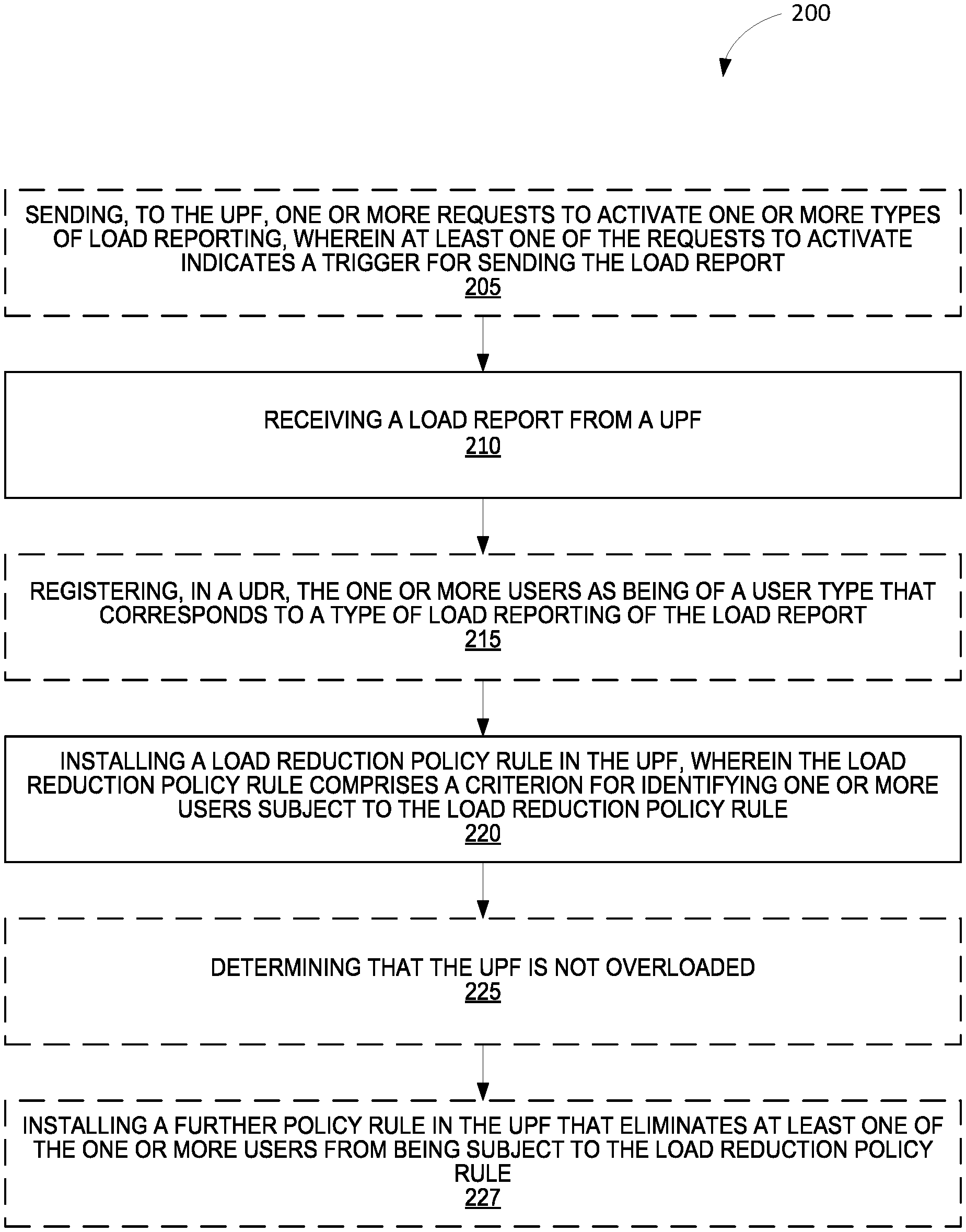 Having received the PFCP session update request, at step 17, the UPF 35 behaves as configured in the reporting info while also controlling load in accordance with the load reduction policies. Accordingly, the UPF 35 sends another load report, heavy user load report, and AV streaming load report at steps 18-20 (respectively) that reflects updated UPF load conditions. As discussed above, the SMF 45, in some embodiments, register users in the UDR 57 that are identified in one or more of the reports as being in a particular class of users (e.g., heavy users, AV streaming users) (not shown).