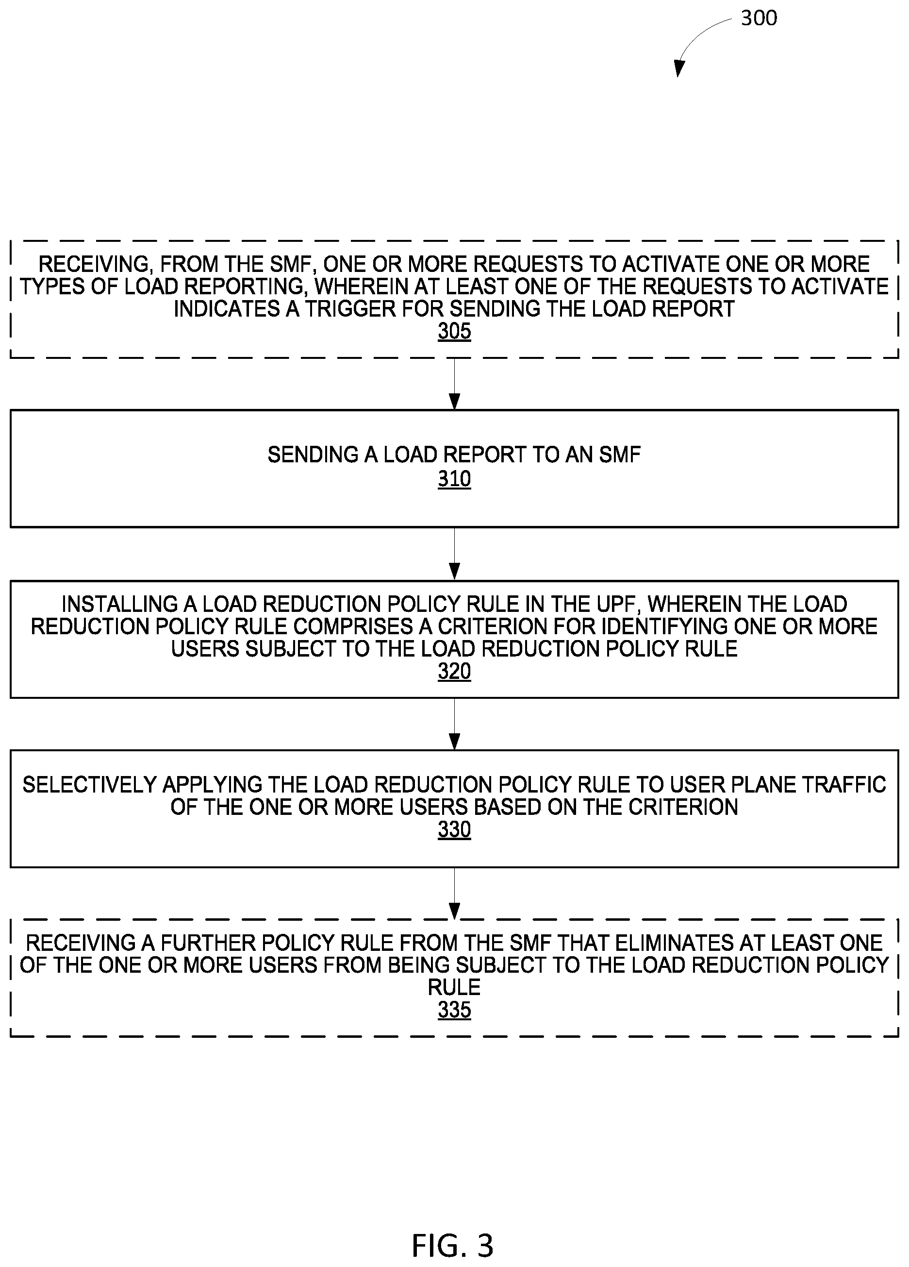 At step 26, the SMF 45 sends a PFCP session update request to the UPF 35. The PFCP session update request includes one or more PFCP rules. In particular, the PFCP session update request may include one or more UPF load reduction policies (e.g., on a per user or traffic category basis). Each UPF load reduction policy may include a PDR and a QER. For example, a load reduction policy suitable for controlling UPF load with respect to AV Streaming users may include a PDR with PDI set to App-ID=Audio-Video-Streaming, and a QER that indicates ABR-Shaping-Level=X. As another example, a load reduction policy suitable for controlling UPF load with respect to heavy users may include a PDR with PDI set to App-ID=Match all, and a QER that indicates BW-Limit=Y.
