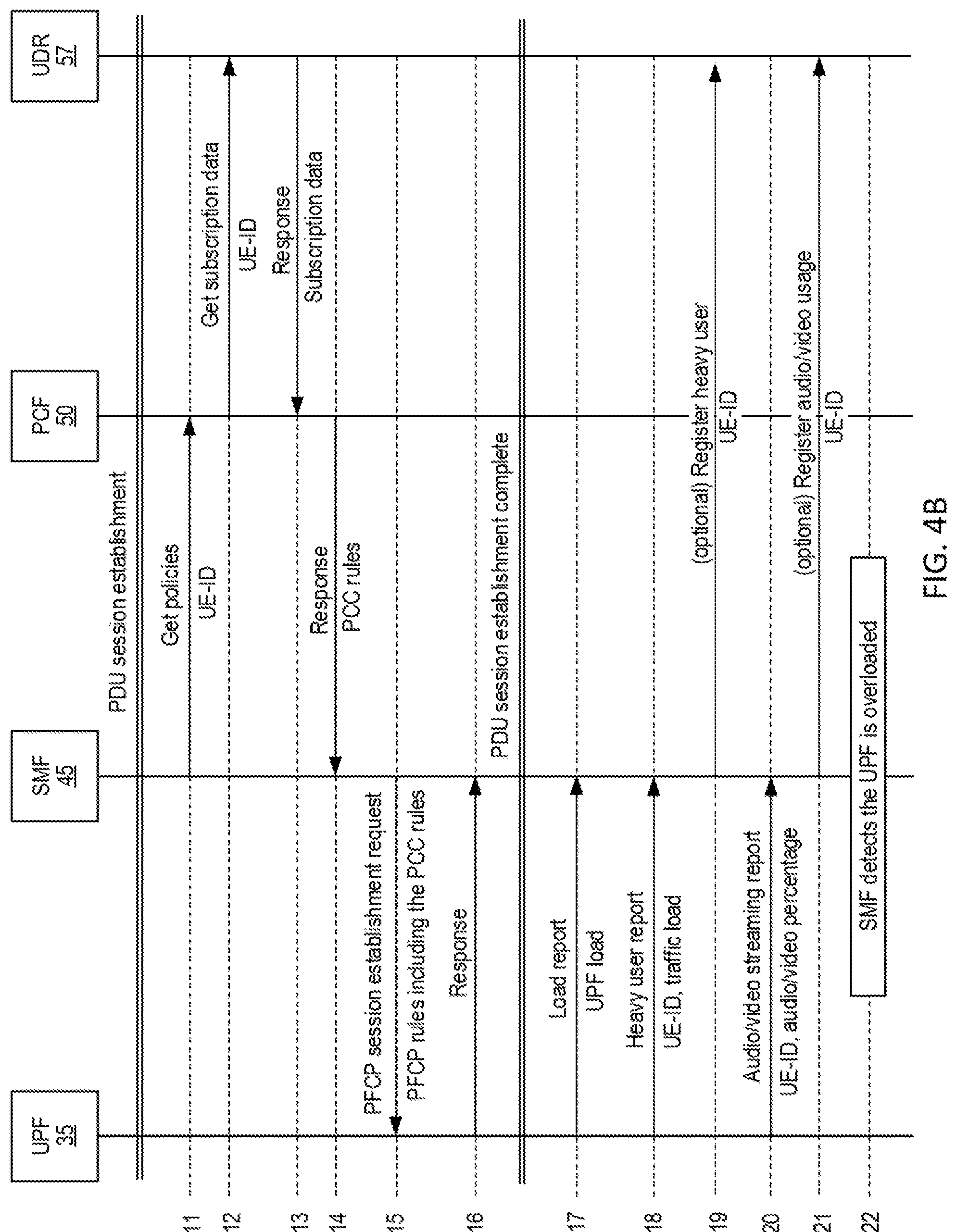 Continuing with reference to FIG. 4B, PDU session establishment commences after step 10, and includes steps 11 through 16. At step 11, the SMF 45 requests one or more policies in the form of PCC rules from the PCF 50. The policy request may comprise, in some embodiments, an identifier of a User Equipment (UE) (i.e., a UE-ID). In response, at step 12 the PCF 50 requests subscription data associated with the UE-ID from the UDR 57. At step 13, the UDR responds to the request from the PCF 50 with the requested subscription data. At this point, the subscription data associated with the UE-ID does not include any indication of being associated with a heavy user or a user of AV streaming. Accordingly, at step 14, the PCF 50 responds to the SMF 45 with the requested policies. In particular, since the since the subscription data does not include any indication that the UE-ID corresponds to a heavy user or AV streaming user, the rules provided may be PCC rules that control user plane traffic under regular operating conditions. That is, the PCC rules provided at this point may not be specifically tailored for a user that is considered a heavy user or AV streaming user.