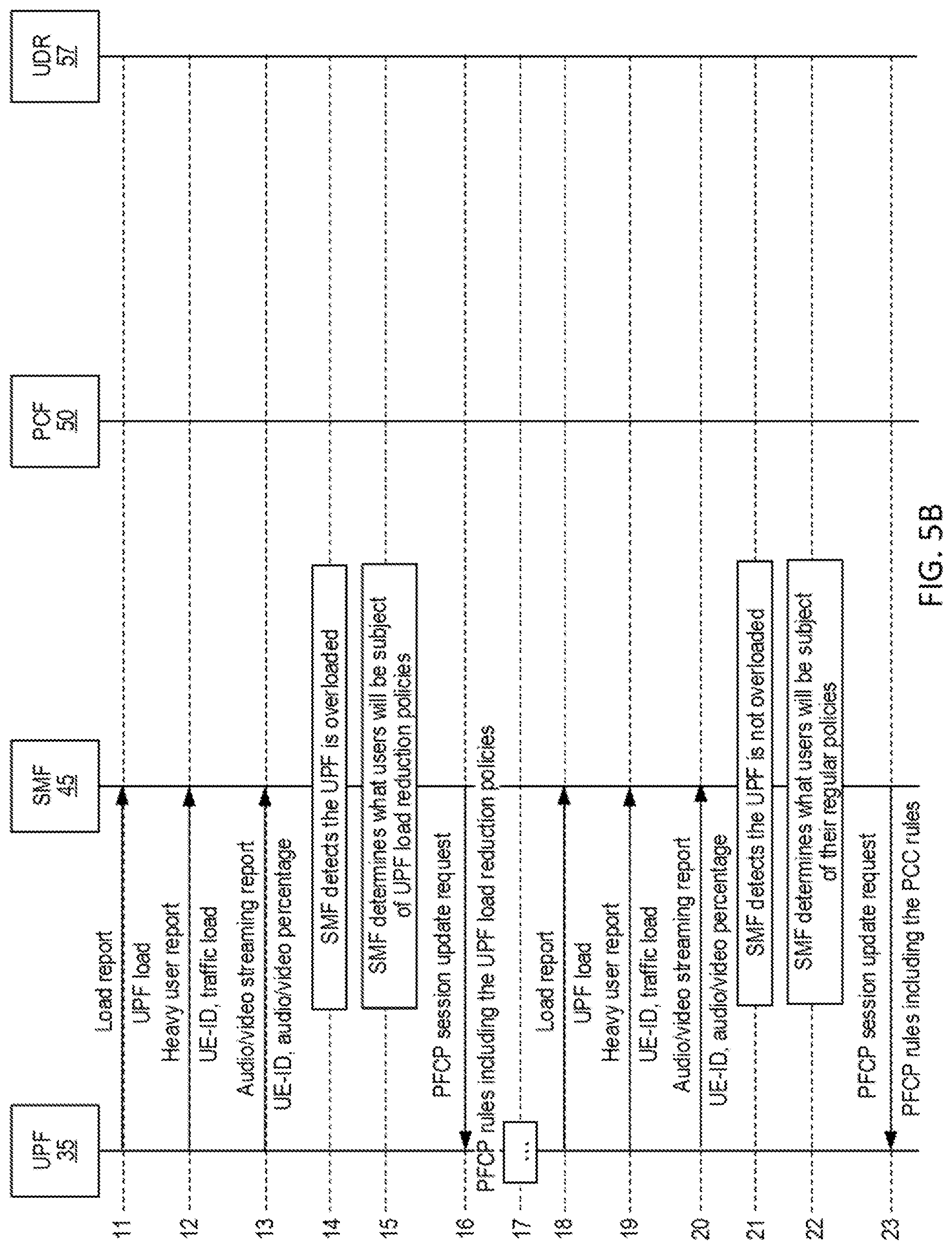 Also, in the example embodiment of FIGS. 5A-5B, load reduction policies are obtained by the SMF 45 from the PCC 50 earlier (i.e., in step 7, along with PCC rules) relative to the example of FIGS. 4A-4C, in which the SMF 45 obtains load reduction policies responsive to detecting that the UPF 35 is overloaded.