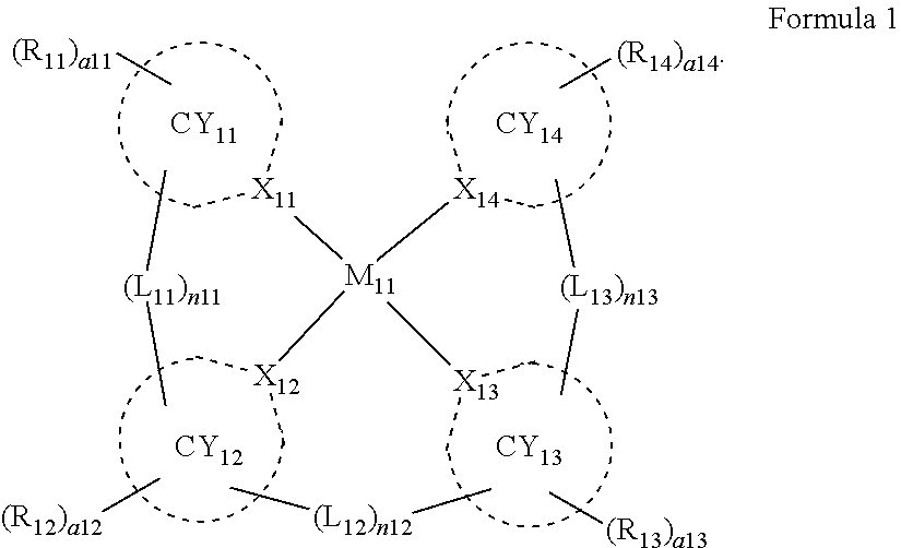 L11to L13in Formula 1 may each independently be a single bond, *—C(R1a)(R1b)—*′, *—C(R1a)═*′, *═C(R1a)—*′, *—C(R1a)═C(R1)—*′, *—C(═O)—*′, *—C(═S)—*′, *—C≡C—*′, *—B(R1a)—*′, *—N(R1a)—*′, *—O—*′, *—P(R1a)—*′, *—Si(R1a)(R1b)—*′, *—P(═O)(R1a)—*′, *—S—*′, *—S(═O)—*′, *—S(═O)2—*′, or *—Ge(R1a)(R1b)—*′, and * and *′ each indicate a binding site to a neighboring atom. For example, in some embodiments, 11 may be a single bond. For example, in some embodiments, L12may be *—O—*′ or *—S—*′. For example, in some embodiments, L13may be a single bond or *—O—*′. n11 to n13 in Formula 1 may each independently be an integer from 1 to 5. In Formula 1, R11to R14, R1a, and R1bmay each independently be hydrogen, deuterium, —F, —Cl, —Br, —I, a hydroxyl group, a cyano group, a nitro group, a C1-C60alkyl group unsubstituted or substituted with at least one R10a, a C2-C60alkenyl group unsubstituted or substituted with at least one R10a, a C2-C60alkynyl group unsubstituted or substituted with at least one R10a, a C1-C60alkoxy group unsubstituted or substituted with at least one R10a, a C3-C60carbocyclic group unsubstituted or substituted with at least one R10a, a C1-C60heterocyclic group unsubstituted or substituted with at least one R10a, a C6-C60aryloxy group unsubstituted or substituted with at least one R10a, a C6-C60arylthio group unsubstituted or substituted with at least one R10a, —C(Q1)(Q2)(Q3), —Si(Q1)(Q2)(Q3), —N(Q1)(Q2), —B(Q1)(Q2), —C(═O)(Q1), —S(═O)2(Q1), or —P(═O)(Q1)(Q2). In one or more embodiments, R11to R14, R1aand R1bmay each independently be: a cyclopentyl group, a cyclohexyl group, a cycloheptyl group, a cyclooctyl group, an adamantanyl group, a norbornanyl group, a norbornenyl group, a cyclopentenyl group, a cyclohexenyl group, a cycloheptenyl group, a phenyl group, a biphenyl group, a (C1-C10alkyl)phenyl group, a naphthyl group, a fluorenyl group, a phenanthrenyl group, an anthracenyl group, a fluoranthenyl group, a triphenylenyl group, a pyrenyl group, a chrysenyl group, a pyrrolyl group, a thiophenyl group, a furanyl group, an imidazolyl group, a pyrazolyl group, a thiazolyl group, an isothiazolyl group, an oxazolyl group, an isoxazolyl group, a pyridinyl group, a pyrazinyl group, a pyrimidinyl group, a pyridazinyl group, an isoindolyl group, an indolyl group, an indazolyl group, a purinyl group, a quinolinyl group, an isoquinolinyl group, a benzoquinolinyl group, a quinoxalinyl group, a quinazolinyl group, a cinnolinyl group, a carbazolyl group, a phenanthrolinyl group, a benzimidazolyl group, a benzofuranyl group, a benzothiophenyl group, a benzoisothiazolyl group, a benzoxazolyl group, an isobenzoxazolyl group, a triazolyl group, a tetrazolyl group, an oxadiazolyl group, a triazinyl group, a dibenzofuranyl group, a dibenzothiophenyl group, a benzocarbazolyl group, a dibenzocarbazolyl group, an imidazopyridinyl group, an imidazopyrimidinyl group, an azacarbazolyl group, an azadibenzofuranyl group, an azadibenzothiophenyl group, an azafluorenyl group, or an azadibenzosilolyl group, each unsubstituted or substituted with at least one selected from among a hydroxyl group, a cyano group, a nitro group, a C1-C20alkyl group, a C1-C20alkoxy group, a cyclopentyl group, a cyclohexyl group, a cycloheptyl group, a cyclooctyl group, an adamantanyl group, a norbornanyl group, a norbornenyl group, a cyclopentenyl group, a cyclohexenyl group, a cycloheptenyl group, a phenyl group, a biphenyl group, a (C1-C10alkyl)phenyl group, a naphthyl group, a fluorenyl group, a phenanthrenyl group, an anthracenyl group, a fluoranthenyl group, a triphenylenyl group, a pyrenyl group, a chrysenyl group, a pyrrolyl group, a thiophenyl group, a furanyl group, an imidazolyl group, a pyrazolyl group, a thiazolyl group, an isothiazolyl group, an oxazolyl group, an isoxazolyl group, a pyridinyl group, a pyrazinyl group, a pyrimidinyl group, a pyridazinyl group, an isoindolyl group, an indolyl group, an indazolyl group, a purinyl group, a quinolinyl group, an isoquinolinyl group, a benzoquinolinyl group, a quinoxalinyl group, a quinazolinyl group, a cinnolinyl group, a carbazolyl group, a phenanthrolinyl group, a benzimidazolyl group, a benzofuranyl group, a benzothiophenyl group, a benzoisothiazolyl group, a benzoxazolyl group, an isobenzoxazolyl group, a triazolyl group, a tetrazolyl group, an oxadiazolyl group, a triazinyl group, a dibenzofuranyl group, a dibenzothiophenyl group, a benzocarbazolyl group, a dibenzocarbazolyl group, an imidazopyridinyl group, an imidazopyrimidinyl group, —Si(Q31)(Q32)(Q33), —N(Q31)(Q32), —B(Q31)(Q32), —P(Q31)(Q32), —C(═O)(Q31), —S(═O)2(Q31), and —P(═O)(Q31)(Q32); or