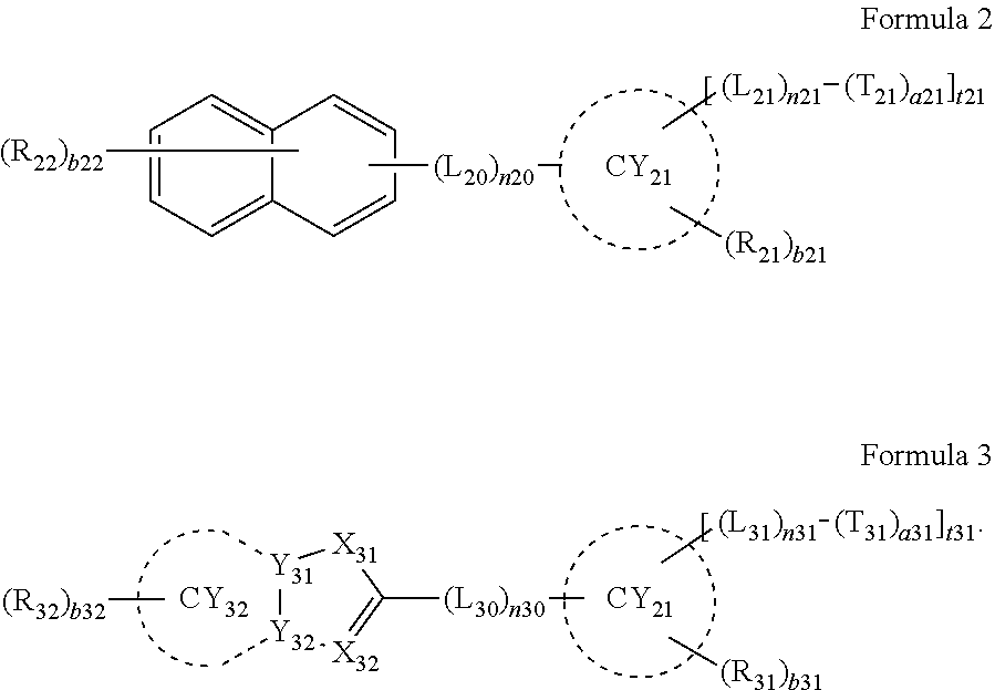 wherein, in Formulae 2-1 to 2-6 and 3-1 to 3-9, X21is C(E21) or N, X22is C(E22) or N, and X23is C(E23) or N, X33is C(E33) or N, X34is C(E34) or N, and X35is C(E35) or N, Y12is O, S, C(E14)(E15), or N(E14), L20, n20, L30, n30, R22, b22, R32, b32, X31, X32, Y31, Y32, and CY32are each as defined in Formulae 2 and 3, L23, L24, L33, and L34are each independently a single bond, a C3-C60carbocyclic group unsubstituted or substituted with at least one R10a, or a C1-C60heterocyclic group unsubstituted or substituted with at least one R10a, n23, n24, n33, and n34 are each independently an integer from 1 to 5, T23and T24are each the same as defined with respect to T21in Formula 2, T33and T34are each the same as defined with respect to T31in Formula 3, a23, a24, a33 and a34 are each independently an integer from 1 to 3, R23, R24, R23a, R24a, R33, R34, R35, R33a, R34a, R35a, E14, E15, E21to E23, and E33to E35are each independently hydrogen, deuterium, —F, —Cl, —Br, —I, a hydroxyl group, a cyano group, a nitro group, a C1-C60alkyl group unsubstituted or substituted with at least one R10a, a C2-C60alkenyl group unsubstituted or substituted with at least one R10a, a C2-C60alkynyl group unsubstituted or substituted with at least one R10a, a C1-C60alkoxy group unsubstituted or substituted with at least one R10a, a C3-C60carbocyclic group unsubstituted or substituted with at least one R10a, a C1-C60heterocyclic group unsubstituted or substituted with at least one R10a, a C6-C60aryloxy group unsubstituted or substituted with at least one R10a, a C6-C60arylthio group unsubstituted or substituted with at least one R10a, —C(Q1)(Q2)(Q3), —Si(Q1)(Q2)(Q3), —B(Q1)(Q2), —C(═O)(Q1), —S(═O)2(Q1), or —P(═O)(Q1)(Q2), b23, b24, b33, and b34 are each independently an integer from 1 to 10, c23, c24, c33, and c34 are each independently an integer from 1 to 3, c35 is an integer from 1 to 6, and R10aand Q1to Q3are each as defined in Formula 1. 15. The organic light-emitting device of and