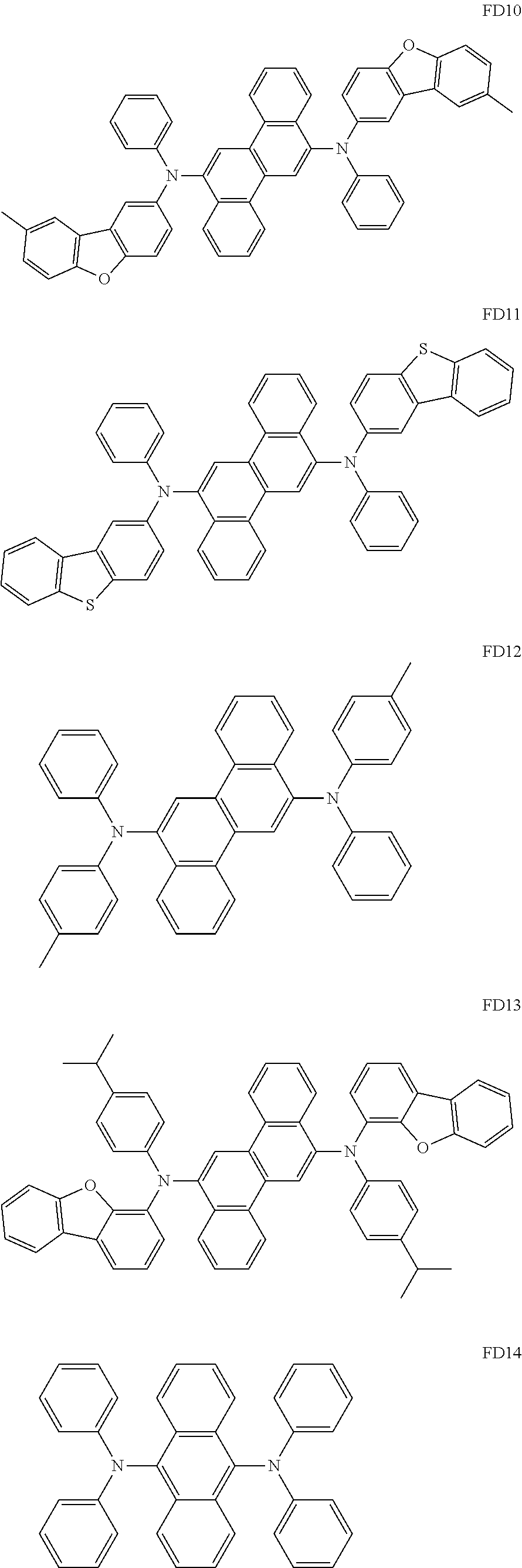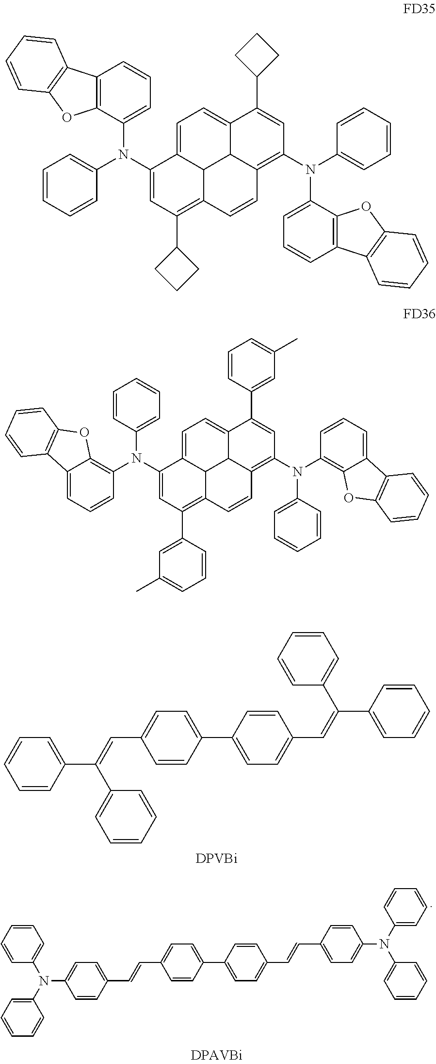 In one or more embodiments, the host may include an alkaline earth metal complex, a post-transition metal complex, or a combination thereof. For example, in some embodiments, the host may include a Be complex (for example, Compound H55), an Mg complex, a Zn complex, or a combination thereof. In one or more embodiments, the host may include at least one selected from among Compounds H1 to H128, 9,10-di(2-naphthyl)anthracene (ADN), 2-methyl-9,10-bis(naphthalen-2-yl)anthracene (MADN), 9,10-di-(2-naphthyl)-2-t-butyl-anthracene (TBADN), 4,4′-bis(N-carbazolyl)-1,1′-biphenyl (CBP), 1,3-di(carbazol-9-yl)benzene (mCP), 1,3,5-tri(carbazol-9-yl)benzene (TCP), and/or a combination thereof: In one or more embodiments, the phosphorescent dopant may include at least one transition metal as a central metal. The phosphorescent dopant may include a monodentate ligand, a bidentate ligand, a tridentate ligand, a tetradentate ligand, a pentadentate ligand, a hexadentate ligand, or a combination thereof. In some embodiments, the phosphorescent dopant may be electrically neutral. For example, in some embodiments, the phosphorescent dopant may include an organometallic compound represented by Formula 401: For example, in Formula 402, i) X401may be nitrogen, and X402may be carbon, or ii) each of X401and X402may be nitrogen. In one or more embodiments, when xc1 in Formula 401 is 2 or more, two ring A401(s) selected from among two or more of L401may optionally be bonded to each other via T402, which is a linking group, and/or two ring A402(s) selected from among two or more of L401may optionally be bonded to each other via T403, which is a linking group (see Compounds PD1 to PD4 and PD7). T402and T403may each be the same as described herein with respect to T401. L402in Formula 401 may be an organic ligand. For example, L402may include a halogen, a diketone group (for example, an acetylacetonate group), a carboxylic acid group (for example, a picolinate group), —C(═O), an isonitrile group, —CN group, a phosphorus group (for example, a phosphine group, a phosphite group, etc.), or a combination thereof. In one or more embodiments, the phosphorescent dopant may include, for example, at least one selected from compounds PD1 to PD39, and/or a combination thereof: In one or more embodiments, the fluorescent dopant may include an amine group-containing compound, a styryl group-containing compound, or a combination thereof. For example, in some embodiments, the fluorescent dopant may include a compound represented by Formula 501: For example, in some embodiments, Ar501in Formula 501 may be a condensed cyclic group (for example, an anthracene group, a chrysene group, or a pyrene group) in which three or more monocyclic groups are condensed together. In one or more embodiments, xd4 in Formula 501 may be 2. For example, in some embodiments, the fluorescent dopant may include: at least one selected from among Compounds FD1 to FD36; 4,4′-bis(2,2-diphenylvinyl)-1,1′-biphenyl (DPVBi); 4,4′-bis[4-(di-phenylamino)styryl]biphenyl (DPAVBi); and/or a combination thereof: In one or more embodiments, the emission layer may include a delayed fluorescence material. In the present disclosure, the delayed fluorescence material may be selected from compounds capable of emitting delayed fluorescent light based on a delayed fluorescence emission mechanism. The delayed fluorescence material included in the emission layer may act as a host or a dopant depending on the type or kind of other materials included in the emission layer. In one or more embodiments, the difference between the triplet energy level (eV) of the delayed fluorescence material and the singlet energy level (eV) of the delayed fluorescence material may be greater than or equal to 0 eV and less than or equal to 0.5 eV. When the difference between the triplet energy level (eV) of the delayed fluorescence material and the singlet energy level (eV) of the delayed fluorescence material satisfies the above-described range, up-conversion from the triplet state to the singlet state of the delayed fluorescence materials may effectively occur, and thus, the luminescence efficiency of the light-emitting device 10 may be improved. For example, in some embodiments, the delayed fluorescence material may include i) a material including at least one electron donor (for example, a π electron-rich C3-C60cyclic group, such as a carbazole group) and at least one electron acceptor (for example, a sulfoxide group, a cyano group, or a π electron-deficient nitrogen-containing C1-C60cyclic group), and/or ii) a material including a C8-C60polycyclic group in which two or more cyclic groups are condensed while sharing boron (B). Non-limiting examples of the delayed fluorescence material may include at least one selected from among Compounds DF1 to DF14: In one or more embodiments, the emission layer may include a quantum dot. The term “quantum dots” as utilized herein refers to crystals of a semiconductor compound, and may include any material capable of emitting light of one or more suitable emission wavelengths according to the size of the crystals. A diameter of the quantum dot may be, for example, in a range of about 1 nm to about 10 nm. The quantum dot may be synthesized by a wet chemical process, a metal organic chemical vapor deposition process, a molecular beam epitaxy process, or any process similar thereto. The wet chemical process is a method including mixing a precursor material with an organic solvent and then growing a quantum dot particle crystal. When the crystal grows, the organic solvent naturally acts as a dispersant coordinated on the surface of the quantum dot crystal and controls the growth of the crystal so that the growth of quantum dot particles can be controlled or selected through a process which costs lower, and is easier than vapor deposition methods, such as metal organic chemical vapor deposition (MOCVD) or molecular beam epitaxy (MBE), The quantum dot