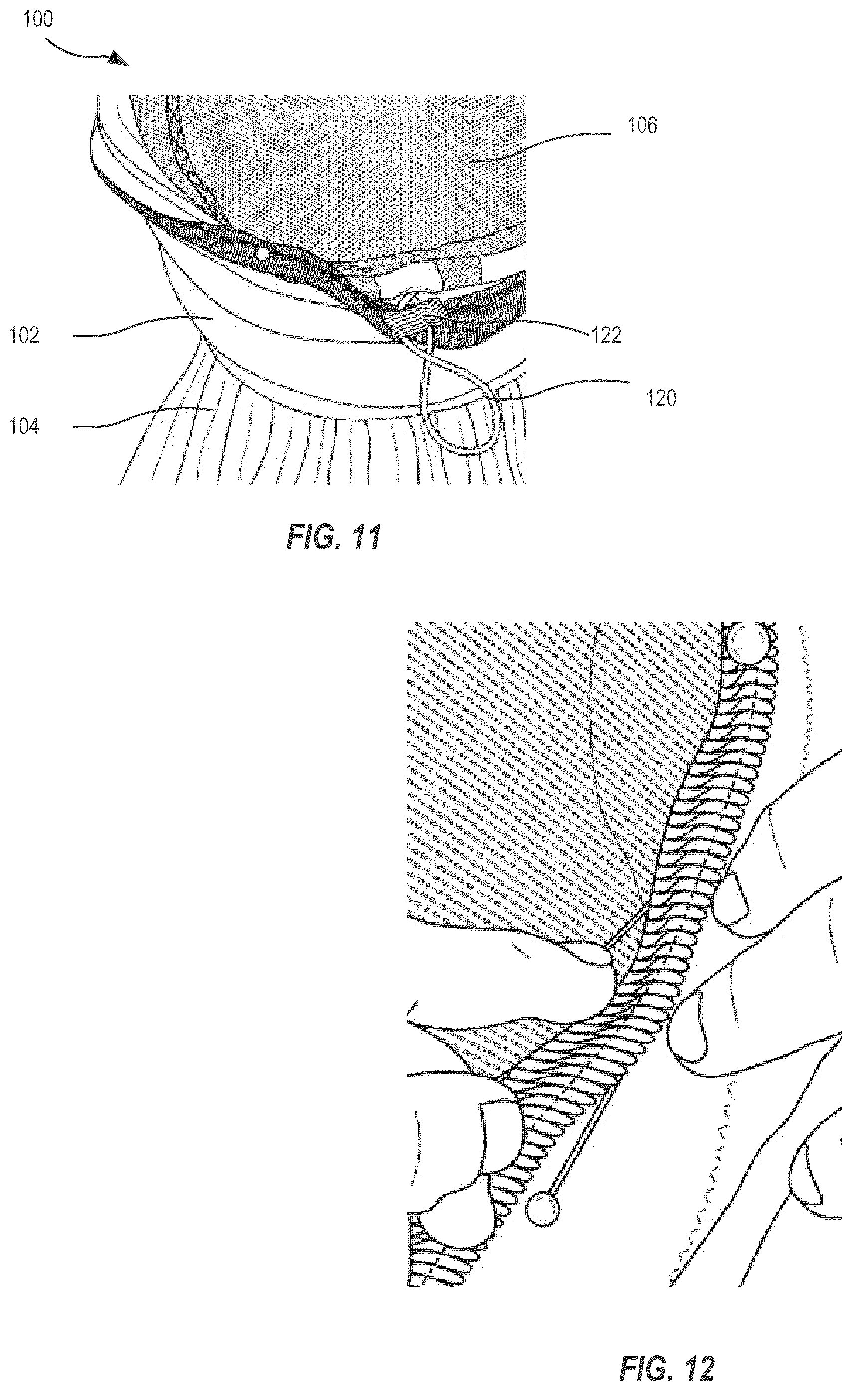 In embodiments, panel 112 may be made from two halves 124 and 126 to further tailor the shape of panel 112. Halves 124 and 126 may be attached to each other using a zig-zag stitch, for example.