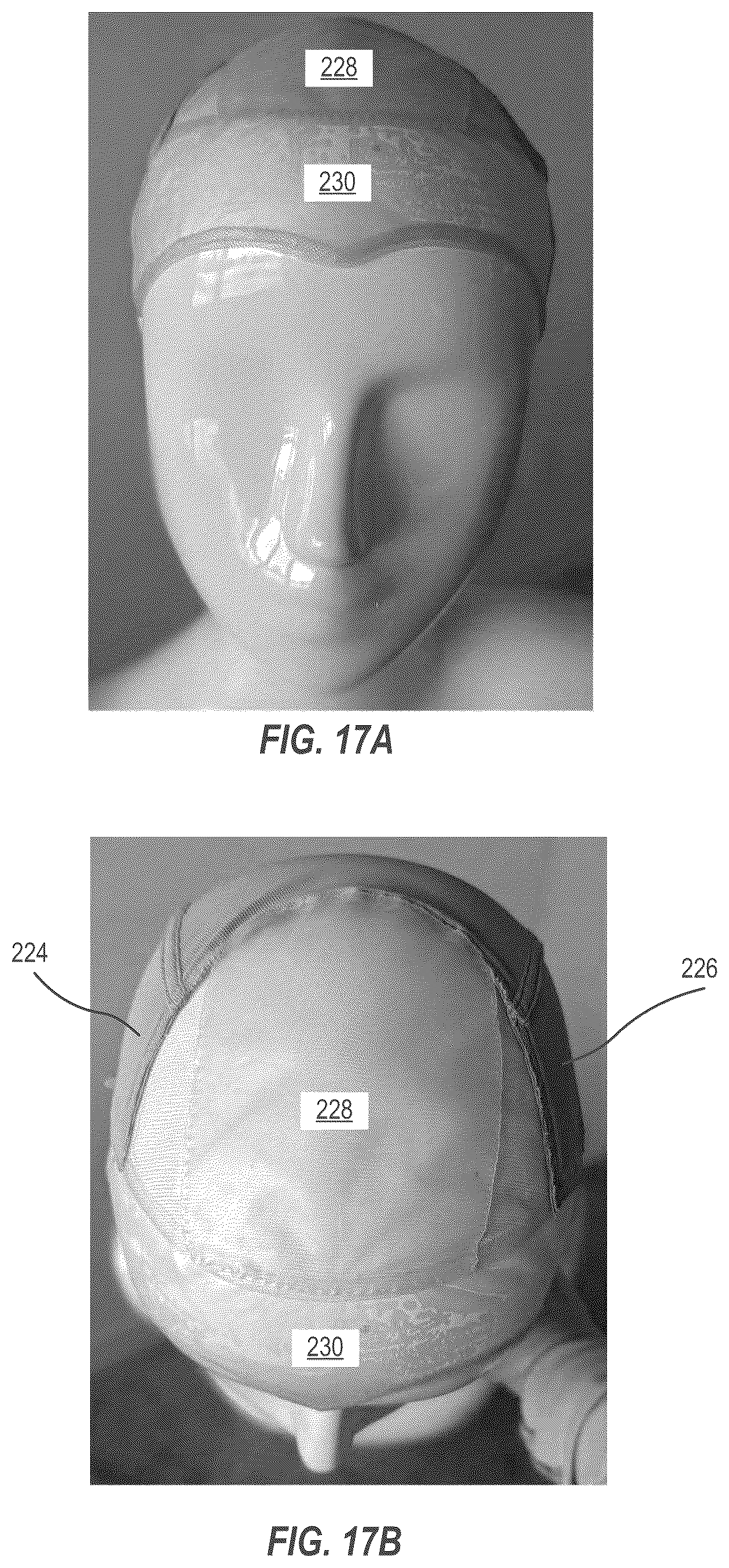 FIG. 16 is a schematic diagram illustrating panels of the full or complete wig cap 220, shown in assembled views in FIGS. 17A-17D. FIGS. 16 and 17A-17D are best viewed together in the follow description.