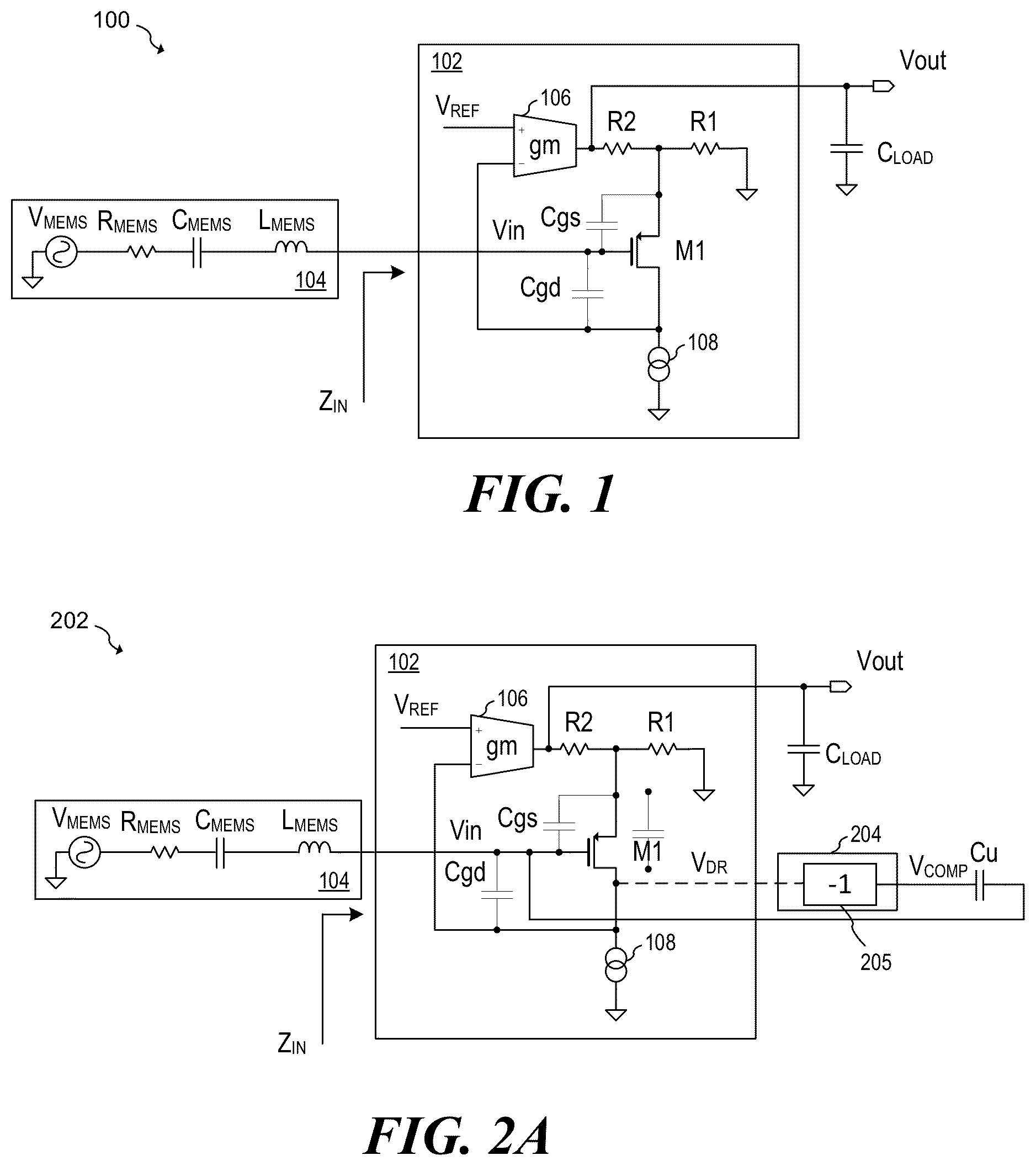amplifying a first output signal from a MEMS device to produce a first amplified output signal using a first circuit comprising a first transistor having a control node coupled to a first input node, and a first amplifier having an input coupled to an output node of the first transistor and an output coupled to a reference node of the first transistor; amplifying a second output signal from the MEMS device to produce a second amplified output signal using a second circuit comprising a second transistor having a control node coupled to a second input node, and a second amplifier having an input coupled to an output node of the second transistor and an output coupled to a reference node of the second transistor; compensating a negative real input resistance of the first circuit by coupling a first compensating signal generated at the output node of the second transistor to the first input node; and compensating a negative real input resistance of the second circuit by coupling a second compensating signal generated at the output node of the first transistor to the second input node. 20. The method of coupling the first compensating signal is performed using a first capacitor; and coupling the first compensating signal is performed using a second capacitor.