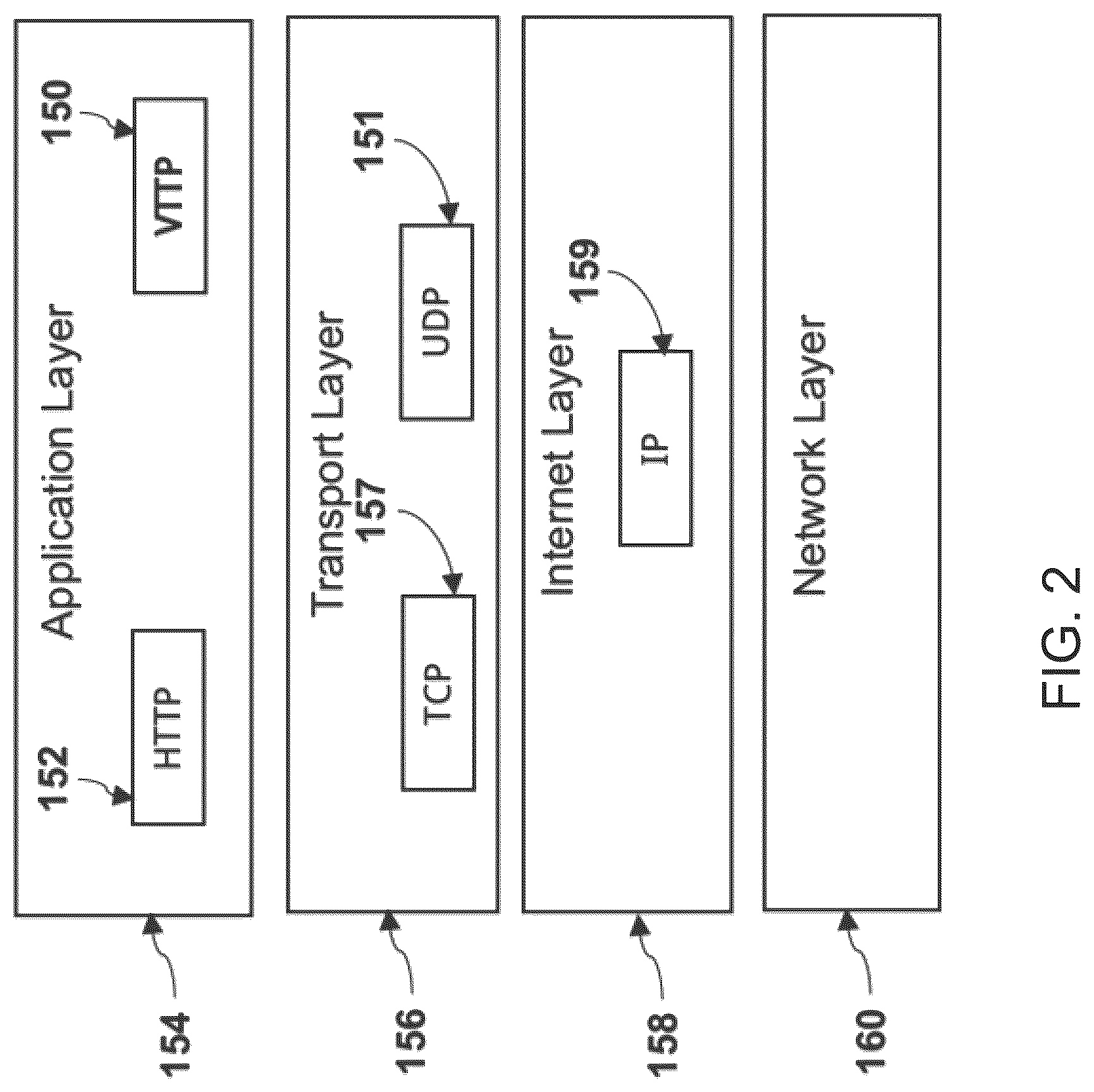 [0087]Referring now to FIG. 2, the TCP/IP reference model layers with the VTTP protocol 150 as part of an application layer 154, is described in more detail. VTTP 150 is an application layer protocol and works alongside Hypertext Transfer Protocol (HTTP) 152 and on top of a transport layer 156 executing Transmission Control Protocol (TCP) 157 and an Internet layer 158 executing Internet Protocol (IP) 159. While TCP is specifically recited, all other transport layer protocols as are known in the art are contemplated and included within the scope of the invention, including, but not limited to, User Datagram Protocol (UDP), SCTP (Stream Controlled Transfer Protocol), and Quick UDP Internet Connections (QUIC). Additionally, while VTTP may operate over the Internet, it is contemplated and included within the scope of the invention that VTTP may operate over any Wide Area Network (WAN), Local Area Network (LAN), Personal Area Network (PAN), cellular network, and the like. Additionally, any communication medium is contemplated and included within the scope of the invention, including, but not limited to, Ethernet, fiber optical communication, cable communication, wireless communication (including radio, visible light, microwave, and any other electromagnetic transmission) such as IEEE 802.xx standards, and any other telecommunication standard, method, or medium. Moreover, VTTP may be implemented on devices operating configured to communicate with other devices, i.e., the Internet of Things (IoT).