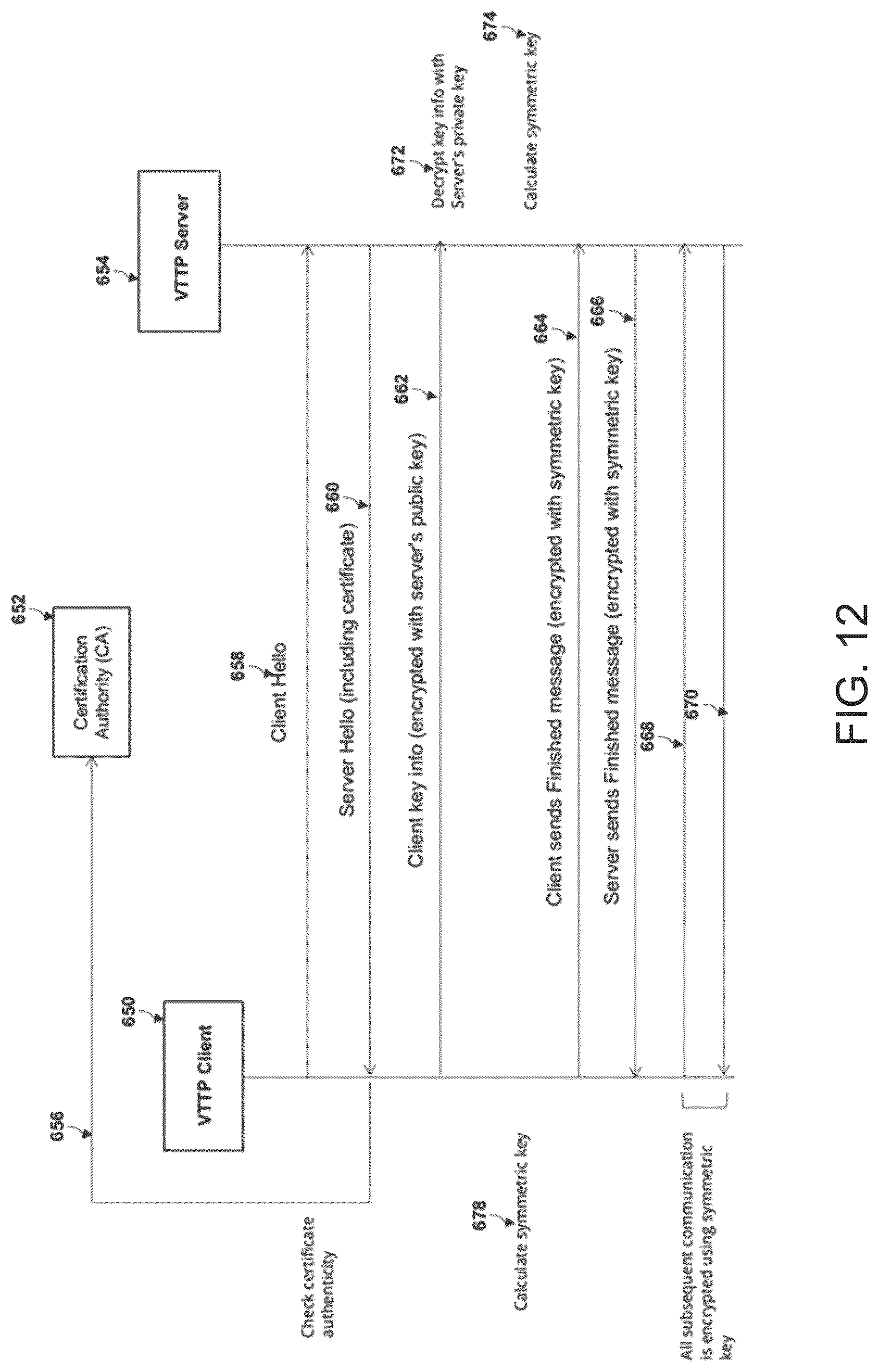 [0125]Referring now to FIG. 12, VTTP Secure (VTTPS), a secure version of VTTP that runs over SSL/TLS, is described in more detail. The use of SSL/TLS allows an encrypted channel of communication between the client and server. A handshake process is done in which the client and server compute a symmetric key which is used to encrypt all communication during their TLS session. At step 658, a VTTP client 650 initiates a handshake by sending a Client Hello message to a VTTP server 654. At step 660, the VTTP server 654 responds with a Server Hello message and the server's certificate. At step 656, the VTTP client 650 authenticates the server's identity by verifying the server certificate with a certificate authority 652. At step 662, the VTTP client 650 sends a key-info containing a random string of data to the server (which is encrypted with the server's public key). After this step the VTTP client 650 and the VTTP server 654 each have the random string of data which is used to calculate (independently) the symmetric key that will be used to encrypt all remaining communication for the duration of that specific TLS session, such calculations being performed at steps 678 and 674, respectively. The VTTP client 650 and the VTTP server 654 then both send respective “Finished” messages that have been encrypted with the symmetric key at the end of the handshake at steps 664 and 666. All subsequent communication 668, 670 between the VTTP client 650 and the VTTP server 654 may be encrypted using the symmetric key.