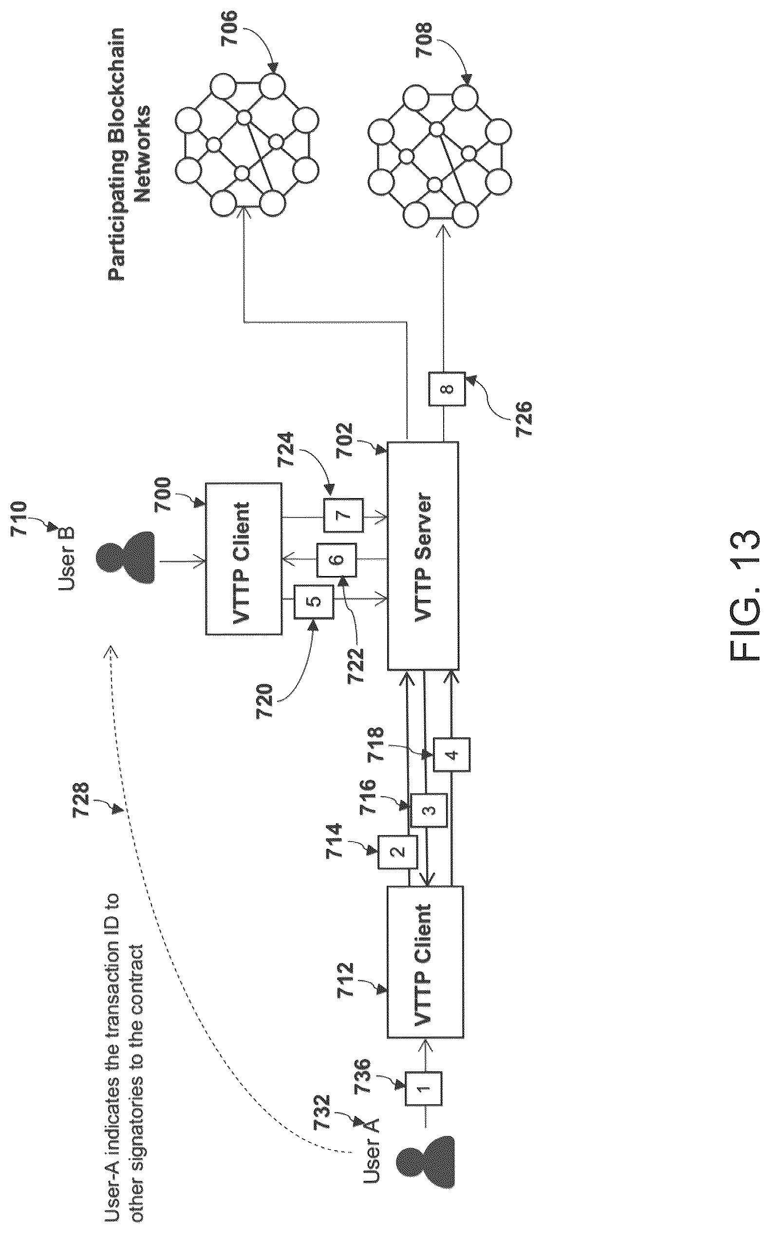 [0126]Referring now to FIG. 13, the multi-signature (“multisig”) transaction signing process in VTTP, is described in more detail. The FIG. 13 shows an example of using VTTP for a multisig contract that requires 2 out of 3 signatures to process a transaction. At step 1736, User A 732 initiates value transfer request to send cryptocurrency or tokens. At step 2714, VTTP client 712 sends a VTTP SEND request to the VTTP server 702. At step 3716, VTTP server 702 generates a raw transaction and returns the same in SEND response. At step 4718, User A 732 signs the raw transaction with the private key and VTTP client 712 sends the VTTP SIGN transaction. At step 728, User A 732 may indicate the transaction ID to other signatories to the contract or other signatories may get a notification from the VTTP server 702. At step 5720, User B 710 retrieves the transaction using the transaction ID. At step 6722, VTTP server 702 returns the raw transaction to be signed by User B 710. At step 7724, User B 710 signs the raw transaction with the private key and VTTP client 700 sends the VTTP SIGN transaction. At step 8726, VTTP server 702 verifies the signatures of User A 732 and User B 710 and broadcasts the transaction to a blockchain network 708.