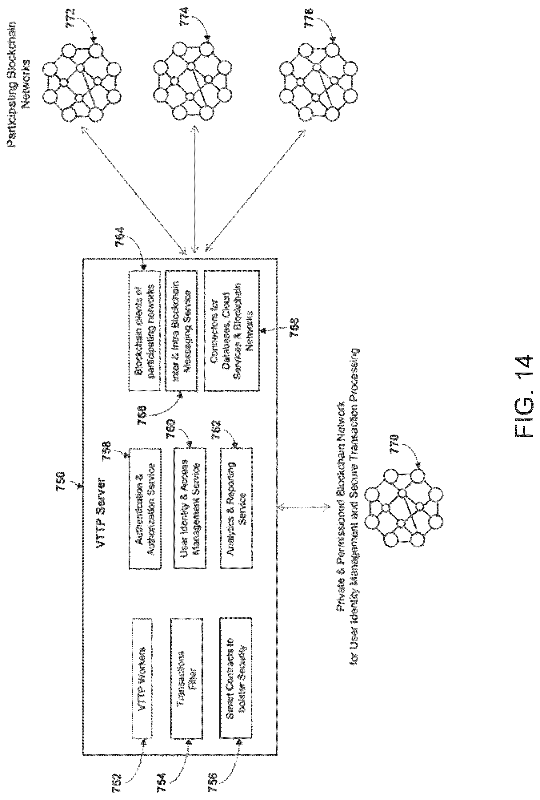 [0127]Referring now to FIG. 14, an exemplary VTTP server architecture, is described in more detail. A VTTP server 750 may have one or more VTTP Workers 752 to process VTTP requests and execute the VTTP commands sent by VTTP clients. VTTP server 750 has blockchain clients 764 for each of the participating blockchain networks 772, 774, 776. A separate blockchain network 770 may be used for user identity and access management. The VTTP server 750 may contain additional services, such as User Identity & Access Management Service 760, Authentication & Authorization Service 758, and Analytics & Reporting Service 762. The VTTP server 750 may contain inter- and intra-blockchain messaging services 766 and connectors for databases, cloud services & blockchain networks 768. A transactions filter 754 may be used in the server to filter transactions. The server may use various Smart Contracts 756 to bolster security. These smart contracts may be executed for each VTTP request and perform additional verification (such as verifying sender and receiver's address). The smart contracts may enforce checks such as time limits or quantity restrictions. Some smart contracts may perform functions similar to virus filters, for filtering out suspicious transactions. New smart contracts can be distributed to VTTP servers in a manner similar to virus updates.