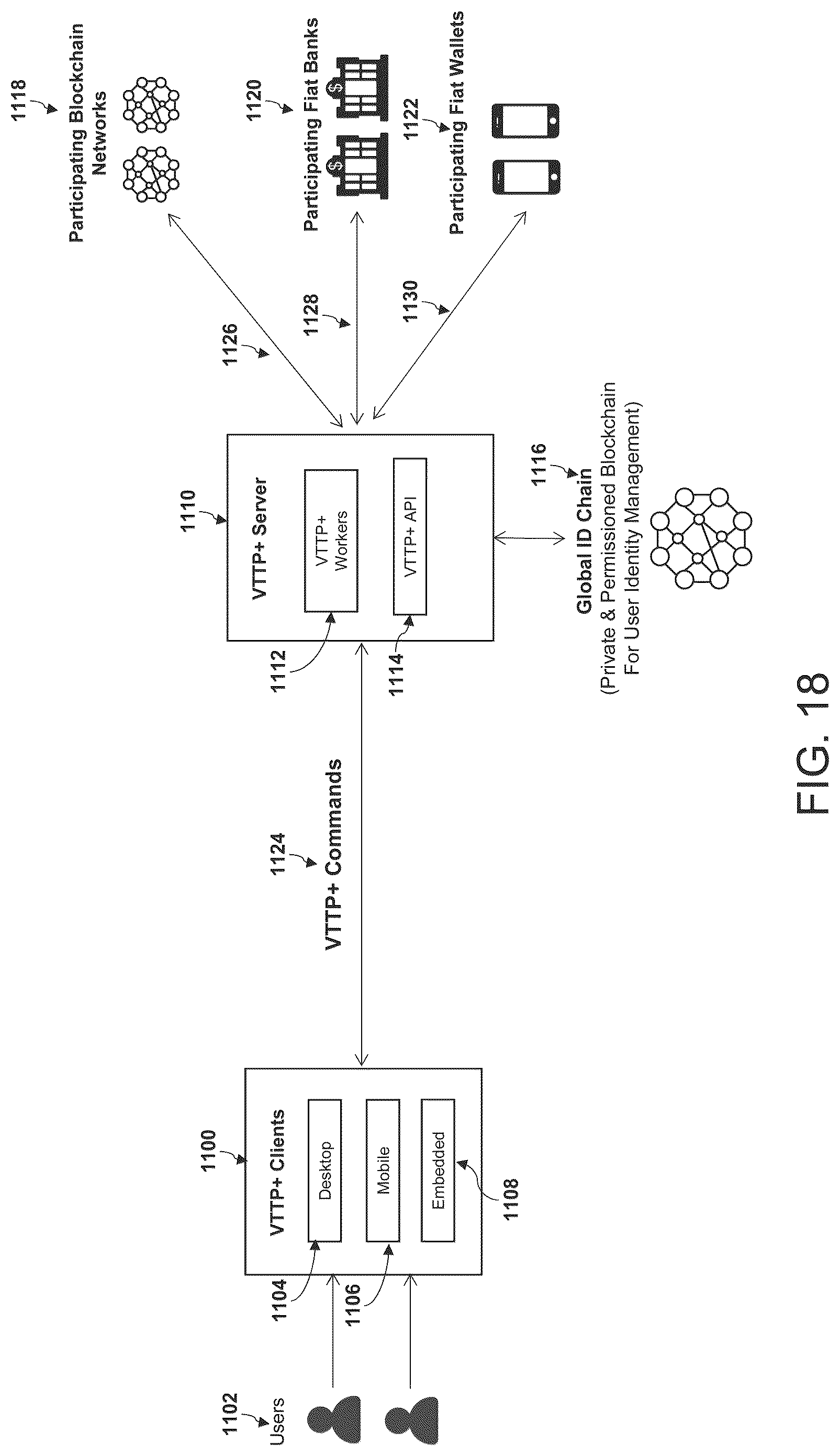 [0131]Referring now to FIG. 18, components of the VTTP+ protocol are described in more detail. In the current embodiment, VTTP+ works as a request-response protocol based on a client-server architecture, where a VTTP+ client 1100 sends requests to a VTTP+Server 1110, and the server 1110 responds to the requests. The VTTP+ clients 1100 may be available for different platforms and devices such as a desktop client 1104, a mobile client 1106 or an embedded client 1108. Users 1102 send VTTP+ requests to the VTTP+ server 1110 using VTTP+ clients 1100. VTTP+ requests contain VTTP+ commands 1124 which are processed by the VTTP+ server 1110. A VTTP+ server 1110 may have one or more VTTP+ Workers 1112 to process VTTP+ requests and execute the VTTP+commands 1124 sent by VTTP+ clients 1100. The VTTP+ server 1110 may provide a VTTP+API 1114 that allows the participating blockchain networks 1118, participating fiat banks 1120 and participating fiat wallets 1122 to use VTTP+ protocol for exchange of value 1126, 1128, 1130. The VTTP+ protocol supports the following types of transactions: