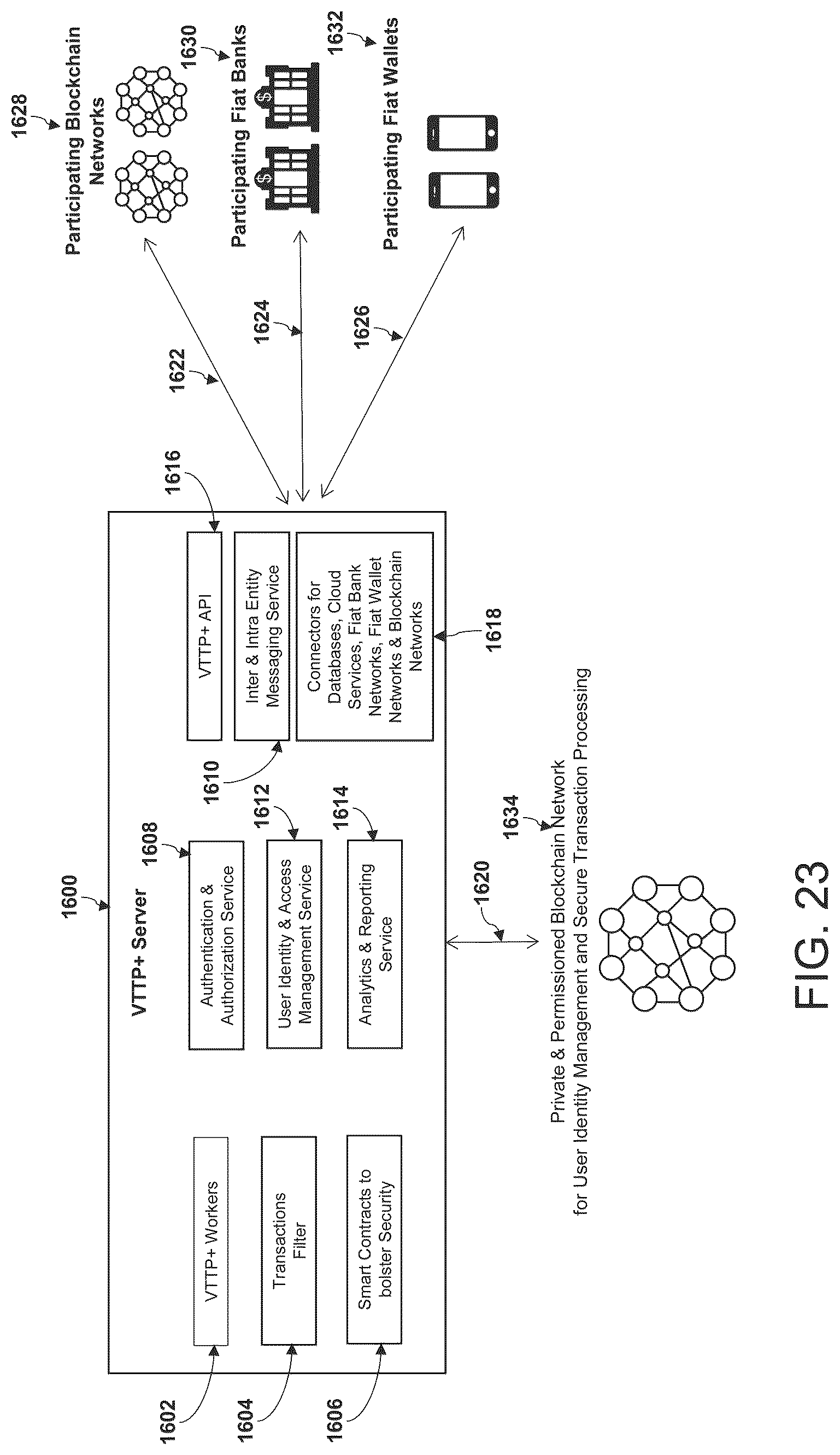 [0143]Referring now to FIG. 23, an exemplary VTTP+ server architecture, is described in more detail. A VTTP+ server 1600 may have one or more VTTP+ Workers 1602 that are individual services to process VTTP+ requests and execute the VTTP+ commands sent by VTTP+ clients. The VTTP+ server 1600 may further comprise a VTTP+API 1616 that allows the participating blockchain networks 1628, participating fiat banks 1630 and participating fiat wallets 1632 to use VTTP+ protocol for exchange of value. A separate blockchain network 1634 may be positioned in communication 1620 with the VTTP+ server 1600 and used for user identity and access management. The VTTP+ server 1600 may further comprise additional services, such as a User Identity & Access Management Service 1612, an Authentication & Authorization Service 1608, and an Analytics & Reporting Service 1614. The VTTP+ server 750 may further comprise inter- and intra-entity messaging services 1610 and connectors for databases, cloud services, fiat bank networks, fiat wallet networks & blockchain networks 1618. A transactions filter 1604 may be comprised by the server 1600 for filtering transactions. The server 1600 may use various Smart Contracts 1606 to bolster security. These smart contracts 1606 may be executed for each VTTP+ request and perform additional verification (such as verifying sender and receiver's address). The smart contracts may enforce checks such as time limits or quantity restrictions. Some smart contracts may perform functions similar to virus filters, for filtering out suspicious transactions. New smart contracts can be distributed to VTTP+ servers in a manner similar to virus updates.