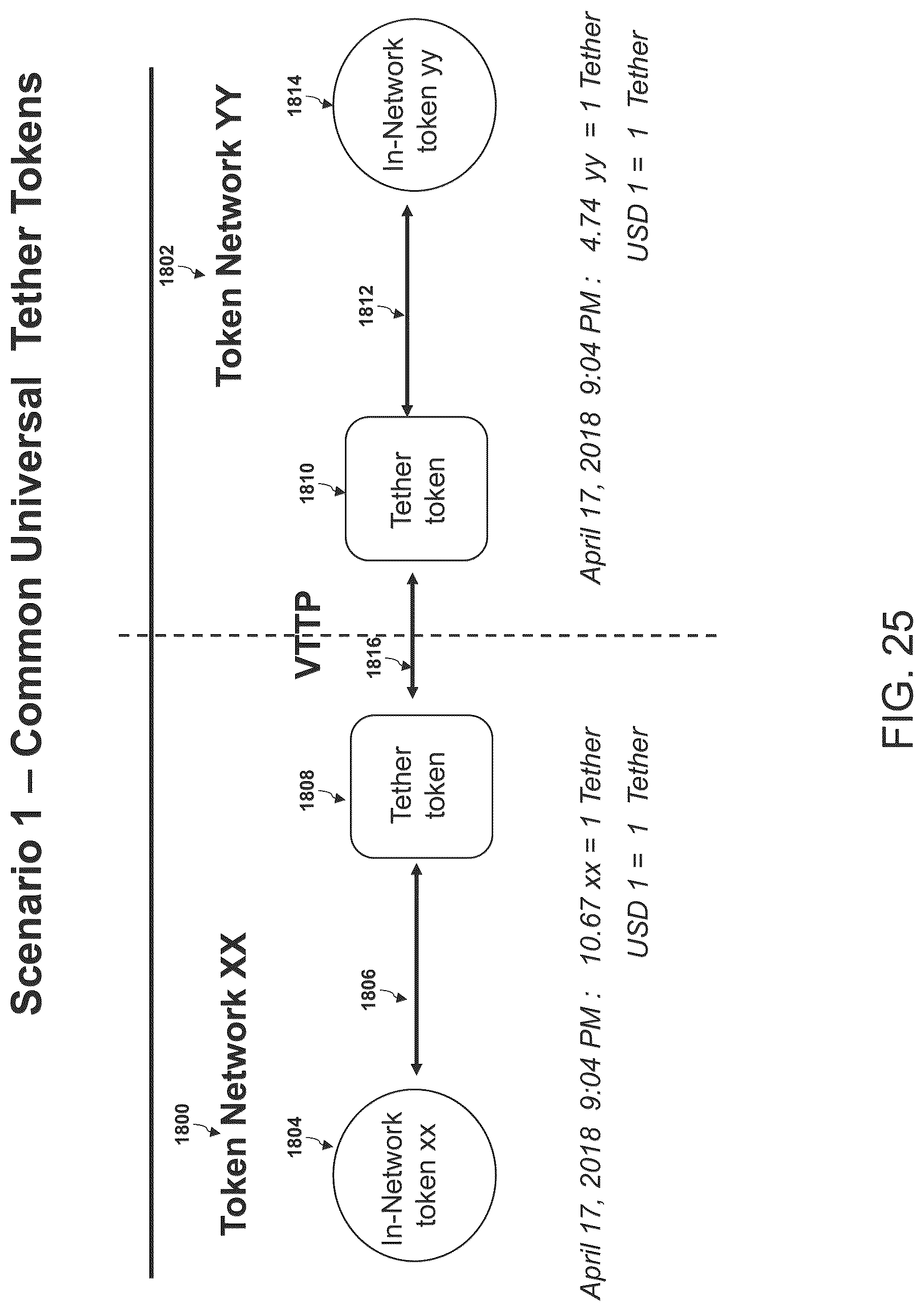 [0059]FIG. 25 is an illustration of an exemplary scenario of value transfer between two networks which use common universal tether tokens, according to an embodiment of the invention.